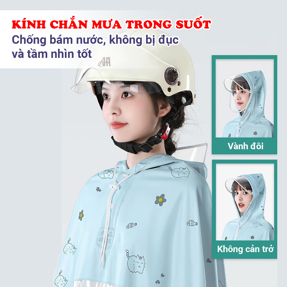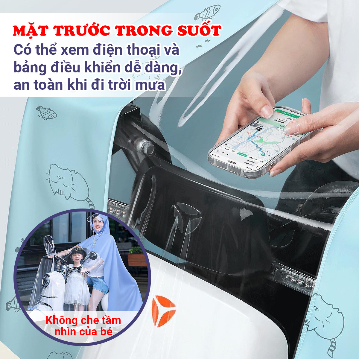 - Mặt trước được thiết kế 1 phần áo trong suốt, không che chắn tầm nhìn của bé, có thể xem điện thoại và bảng điều khiển dễ dàng, an toàn khi đi trong mưa