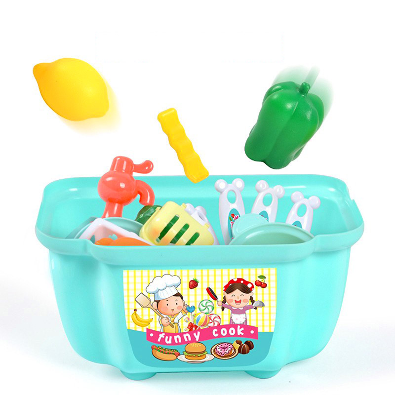 - Bộ đồ chơi nấu ăn gồm nhiều nguyên vật liệu nấu ăn và vật dụng trong nhà bếp: Xoong nồi, đĩa, cốc, thìa, dĩa, dao, chảo, bắp cải, bắp, cà rốt..... như đời thực cho đồ chơi thêm sống động
