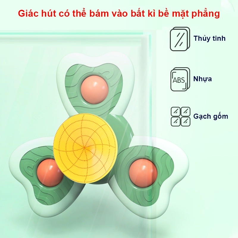 - Con quay spinner đi kèm với một giác hút ở phía dưới có thể bám vào bất cứ bề mặt kim loại, nhựa, kính nào nhẵn và phẳng để bé yêu của bạn không bị giới hạn trong việc tận hưởng niềm vui với con quay dễ thương này