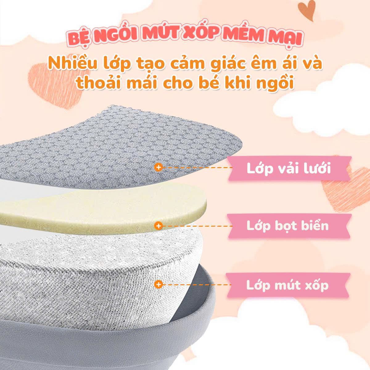 - Được sử dụng chất vải lưới 3D cao cấp bao quanh bé, đảm bảo lưu thông không khí thoáng mát và bề mặt êm mịn cho da bé trong suốt thời gian sử dụng