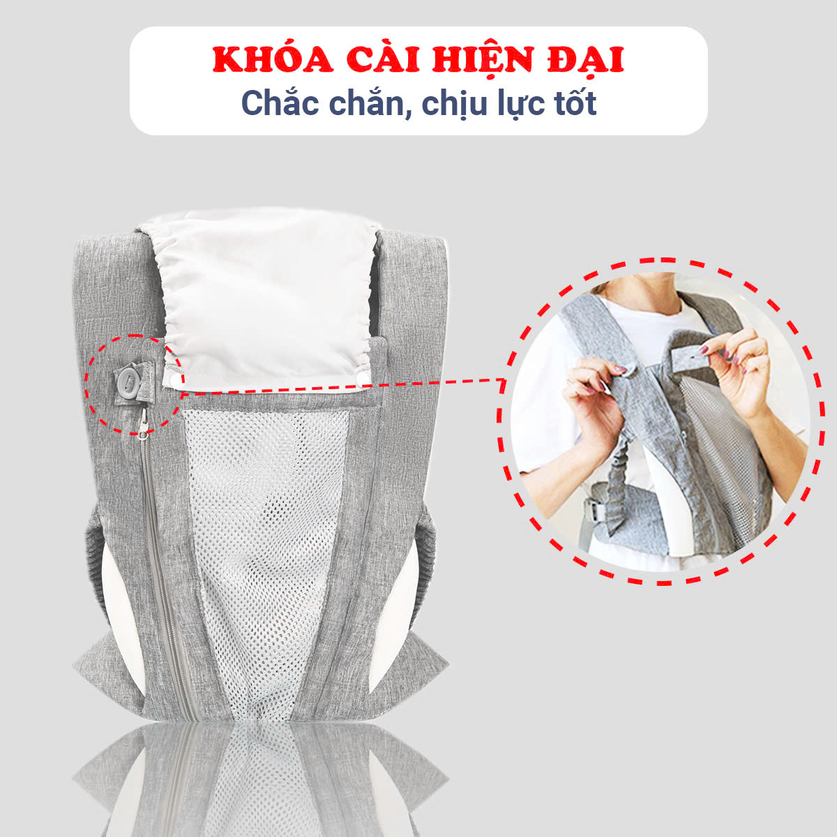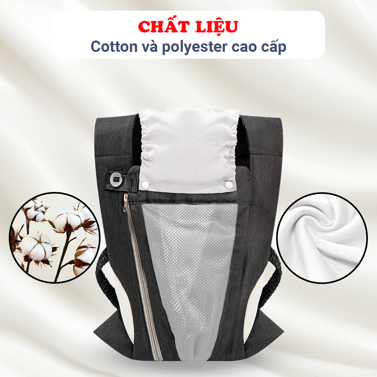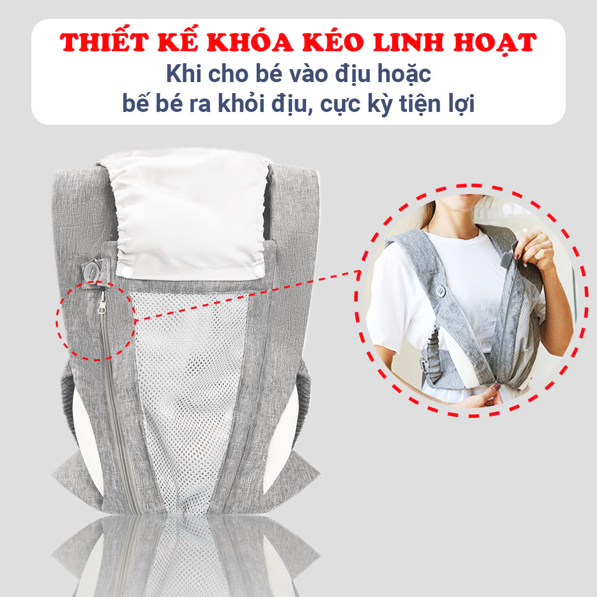 - Mặt trước thiết kế khóa kéo giúp linh hoạt khi cho bé vào địu hoặc bế bé ra khỏi địu, cực kỳ tiện lợi