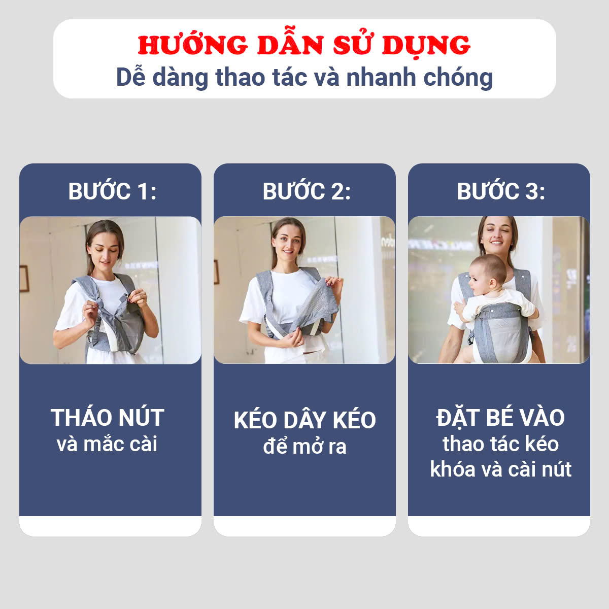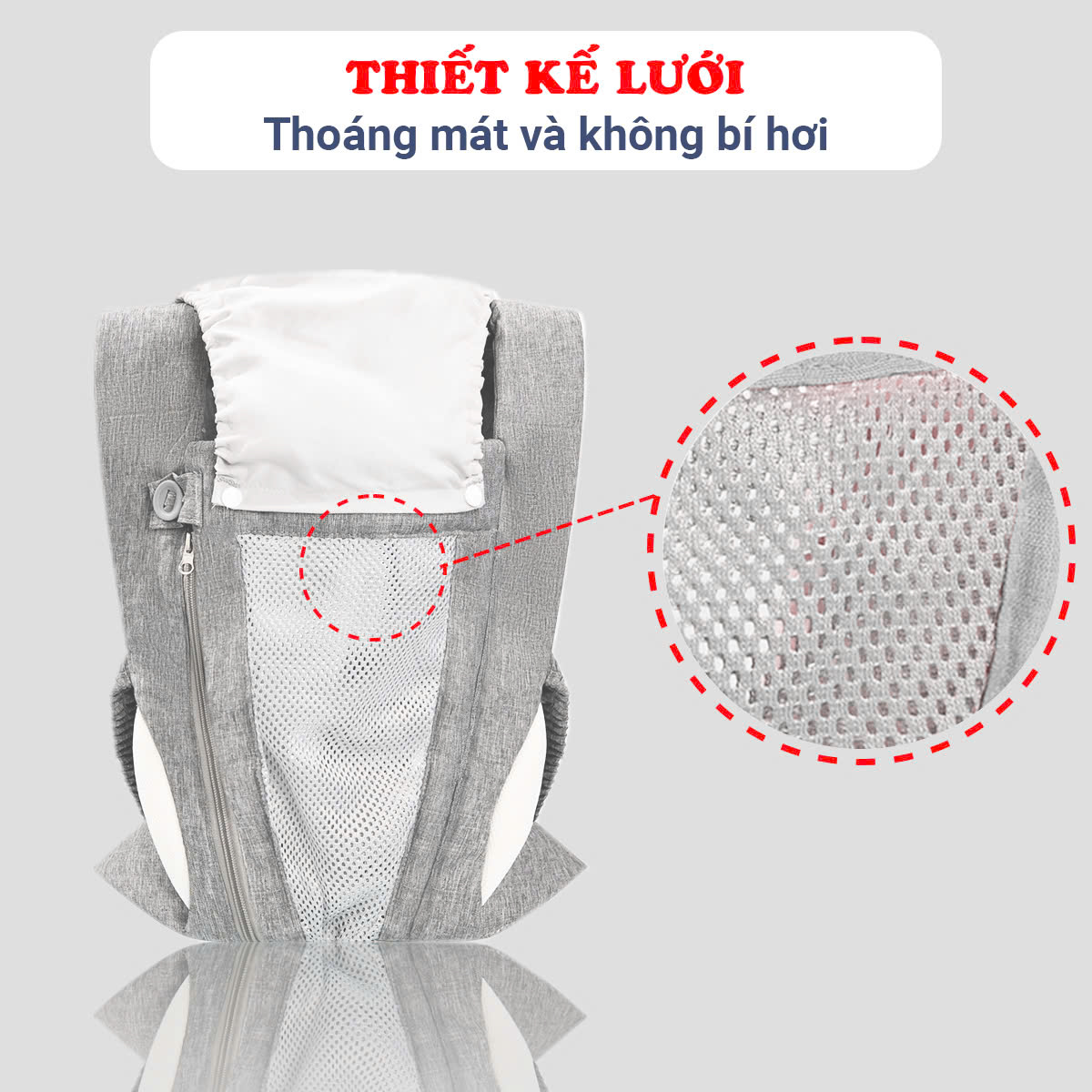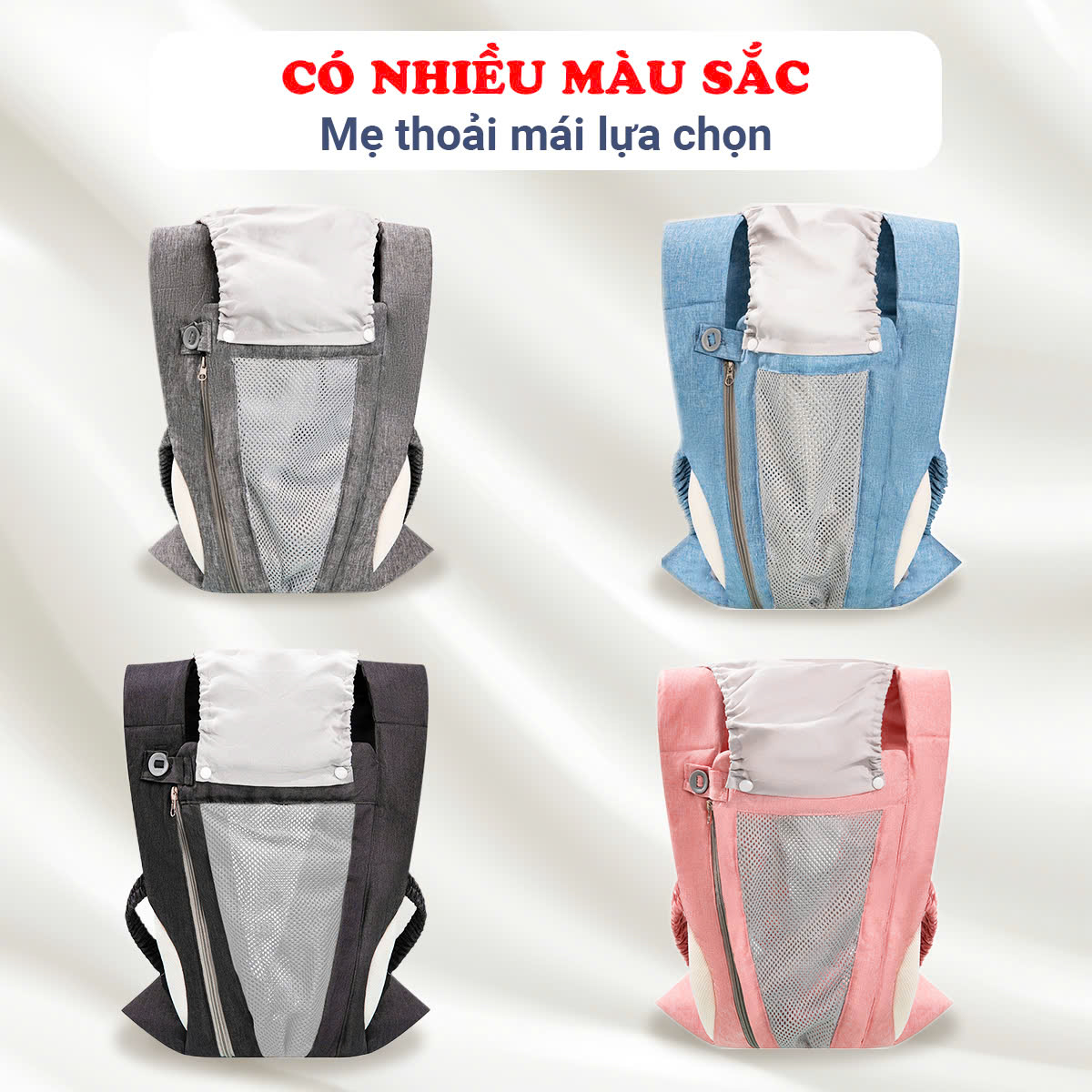 - Mặt trước thiết kế khóa kéo giúp linh hoạt khi cho bé vào địu hoặc bế bé ra khỏi địu, cực kỳ tiện lợi