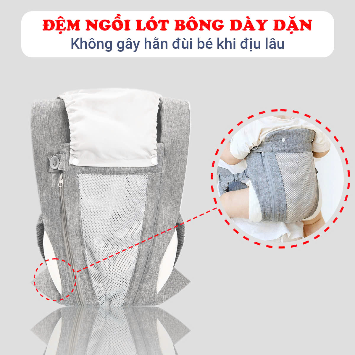 - Đệm ngồi lót bông dày dặn không gây hằn đùi bé khi địu lâu