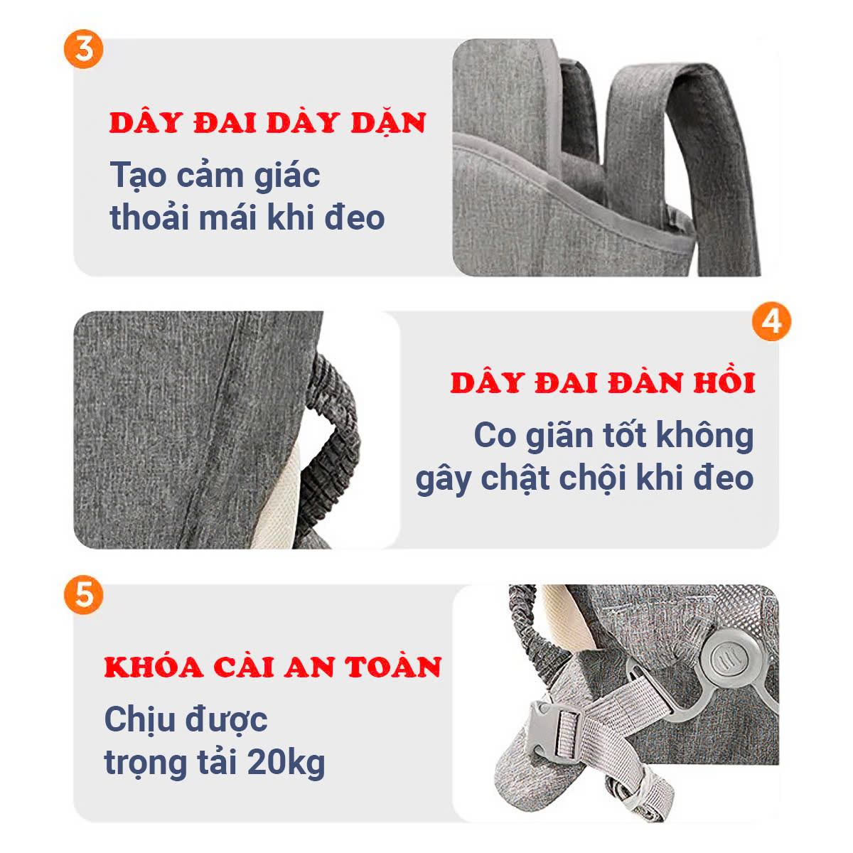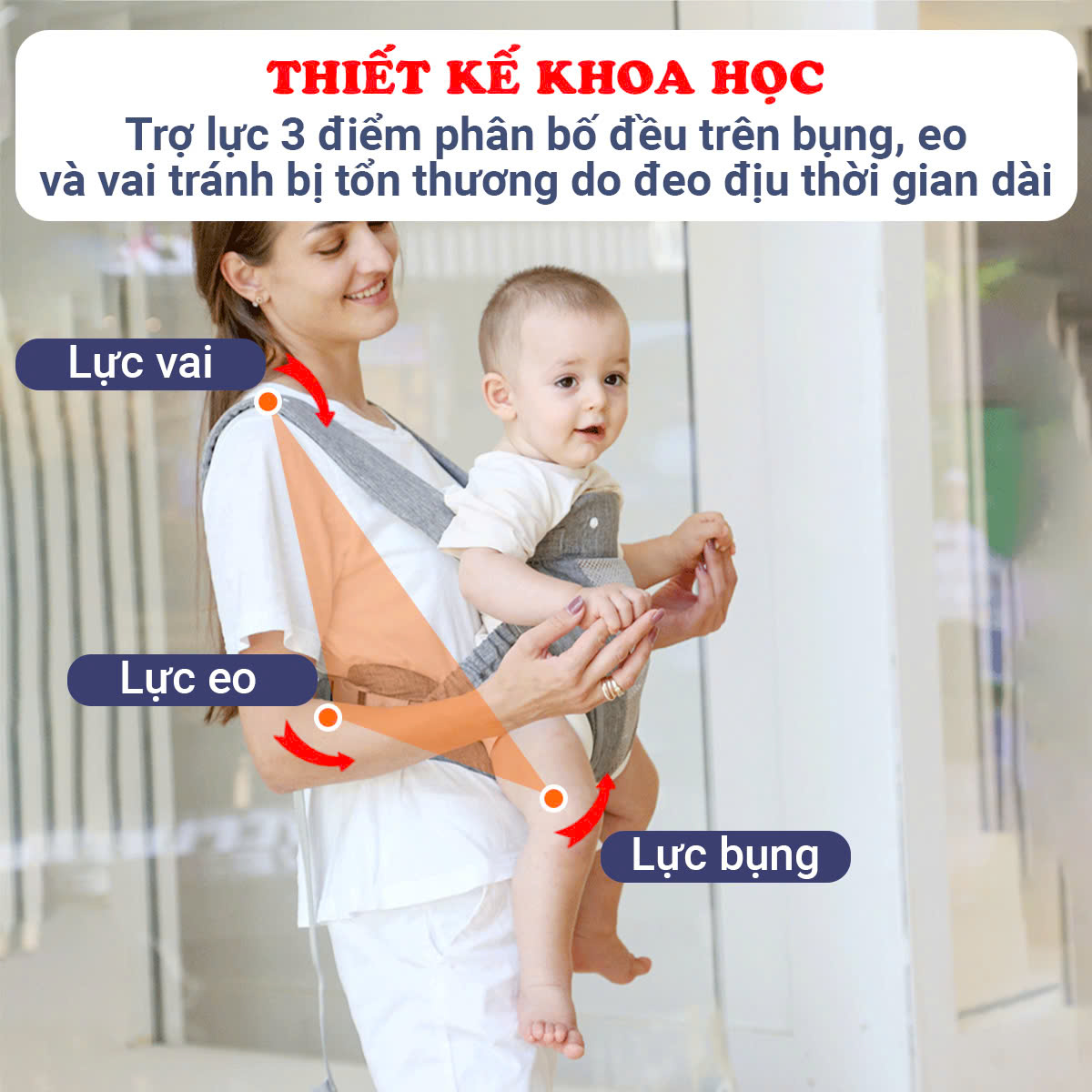 - Thiết kế khoa học, các điểm chịu lực được phân bổ đều trên bụng, eo và vai, 3 điểm này được cân bằng để tránh bị tổn thương do đeo địu thời gian dài