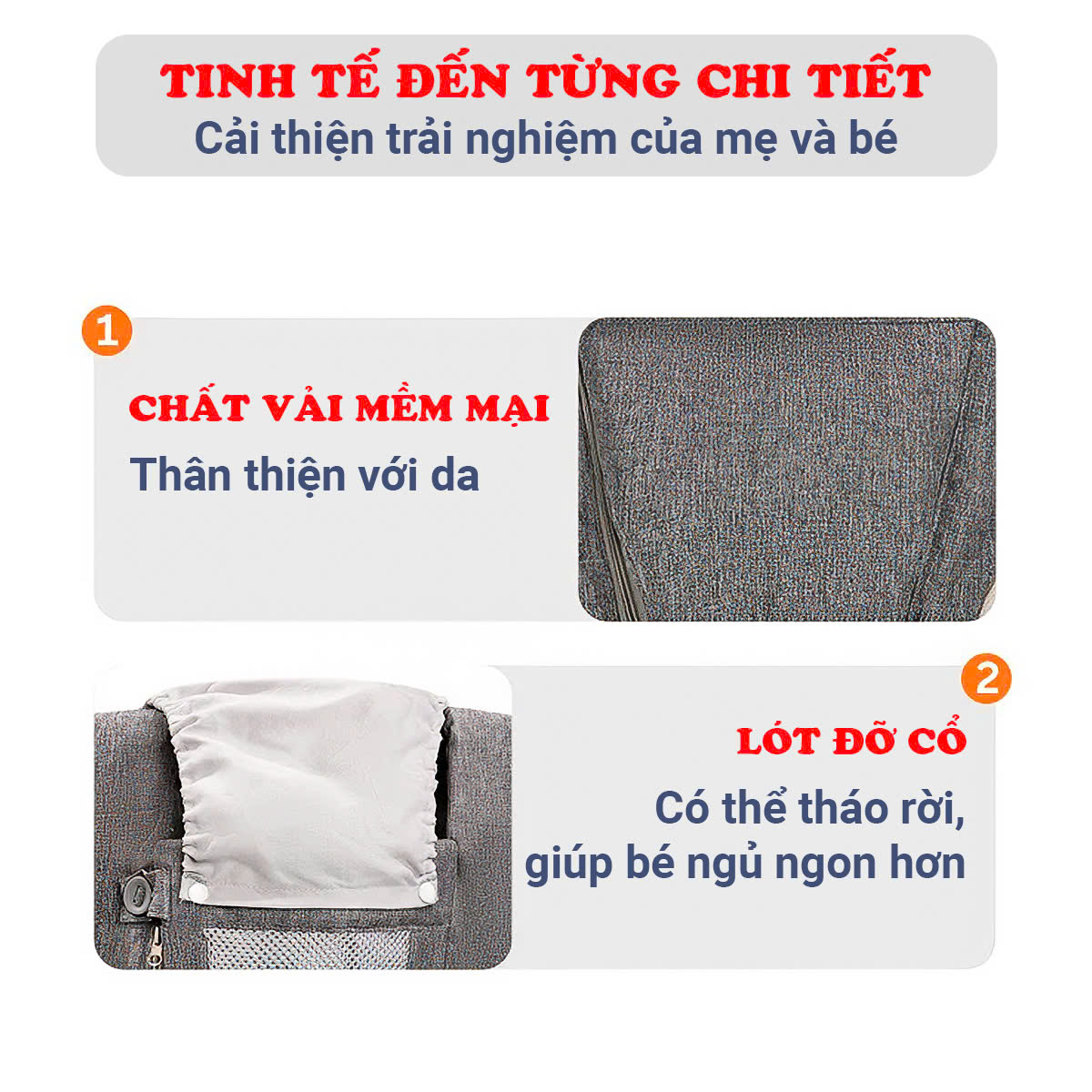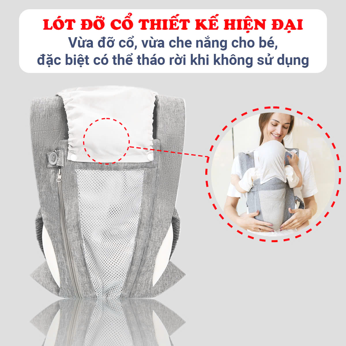 - Lót đỡ cổ thiết kế hiện đại vừa đỡ cổ, vừa che nắng cho bé, đặc biệt có thể tháo rời khi không sử dụng