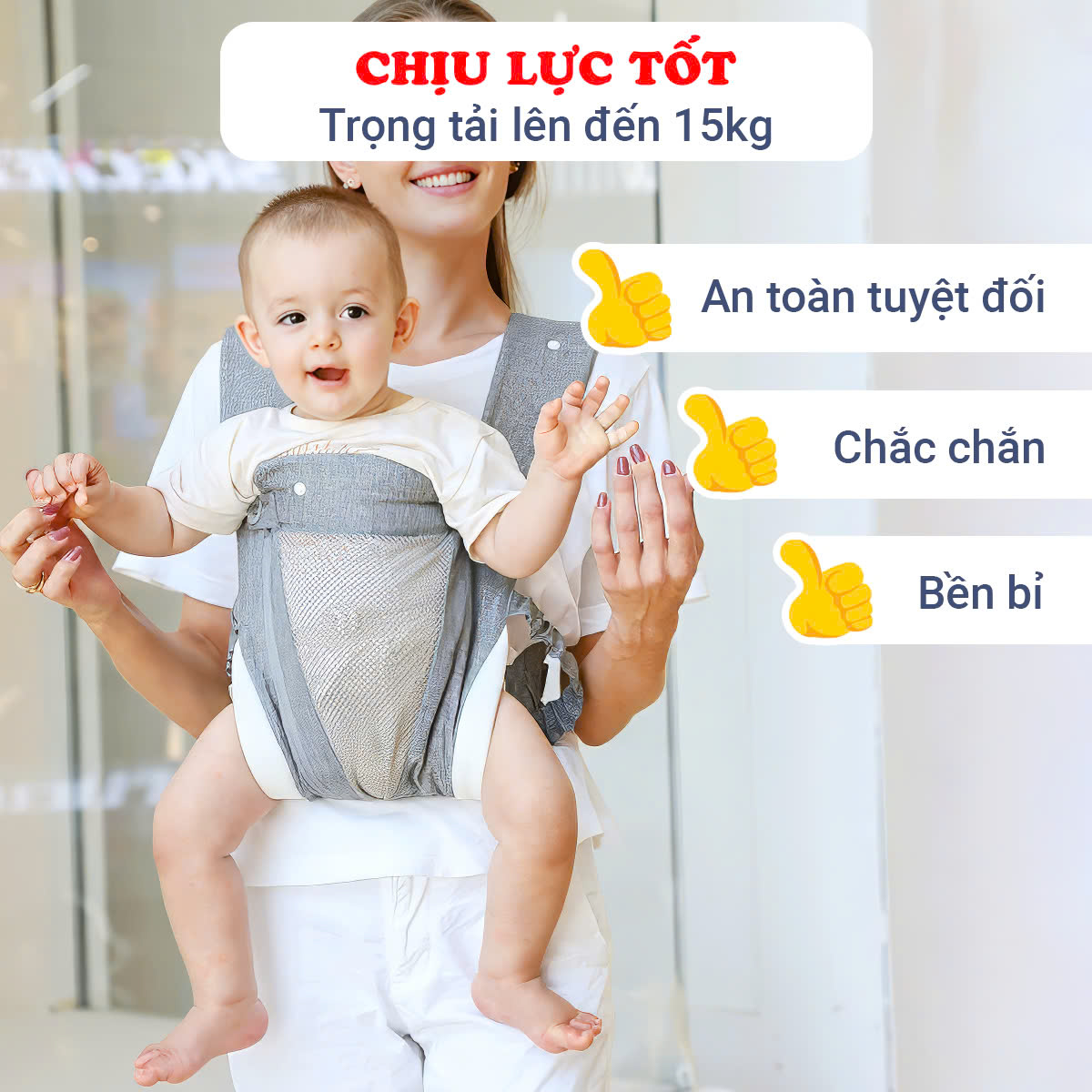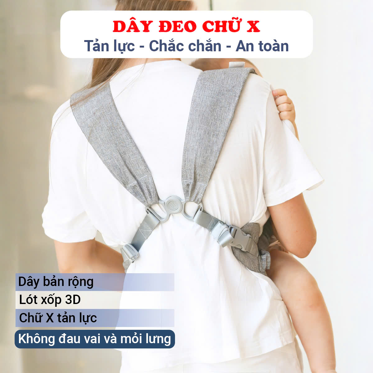 - Dây đeo vai được thiết kế dáng chữ X giúp tản lực đều tạo cảm giác thoải mái nhẹ nhàng khi địu bé