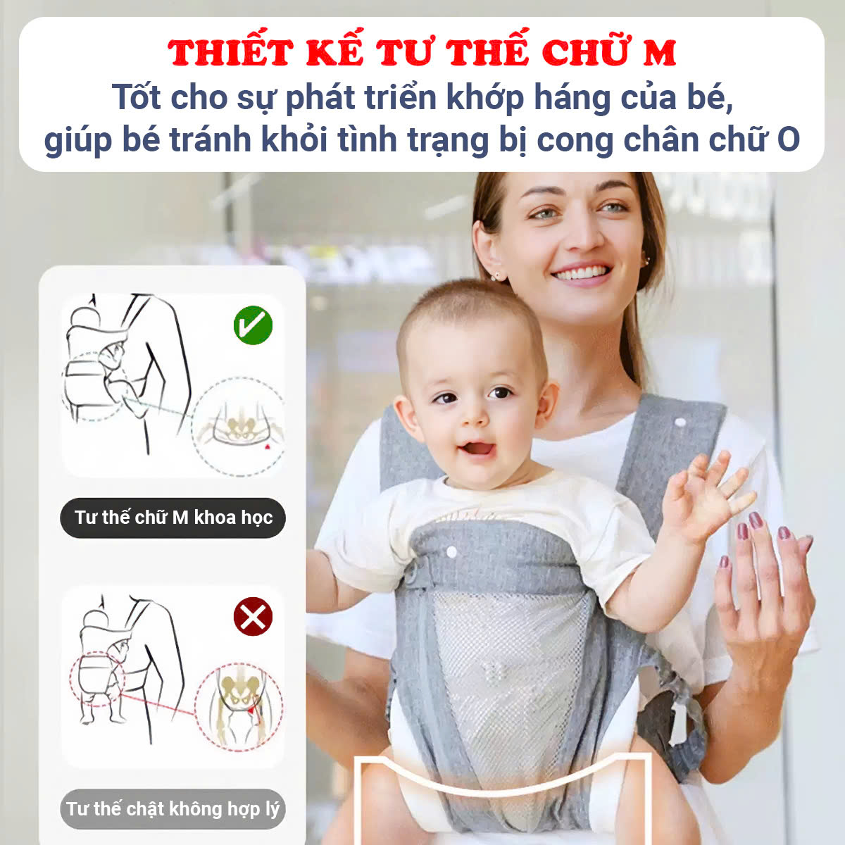 - Được thiết kế tư thế chữ M tốt cho sự phát triển khớp háng của bé, giúp bé tránh khỏi tình trạng bị cong chân chữ O