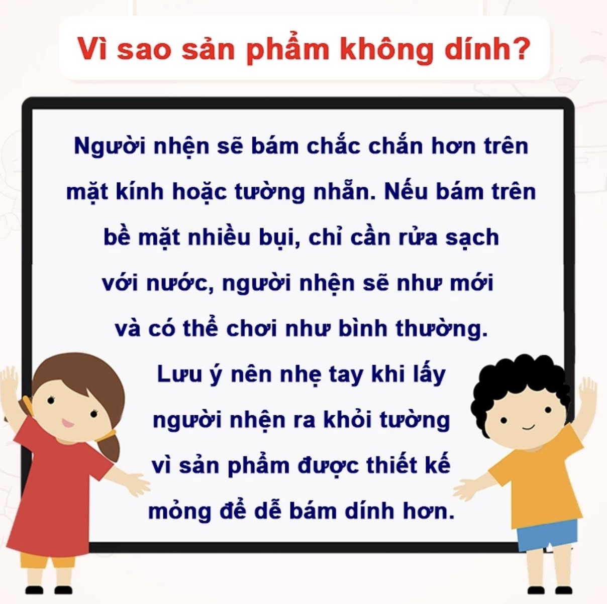 - Sau khi chơi một vài lần sản phẩm sẽ bị bám bụi, bố mẹ hãy giúp các con rửa sạch sản phẩm để ráo nước, tăng khả năng bám dính như mới nhé!!
