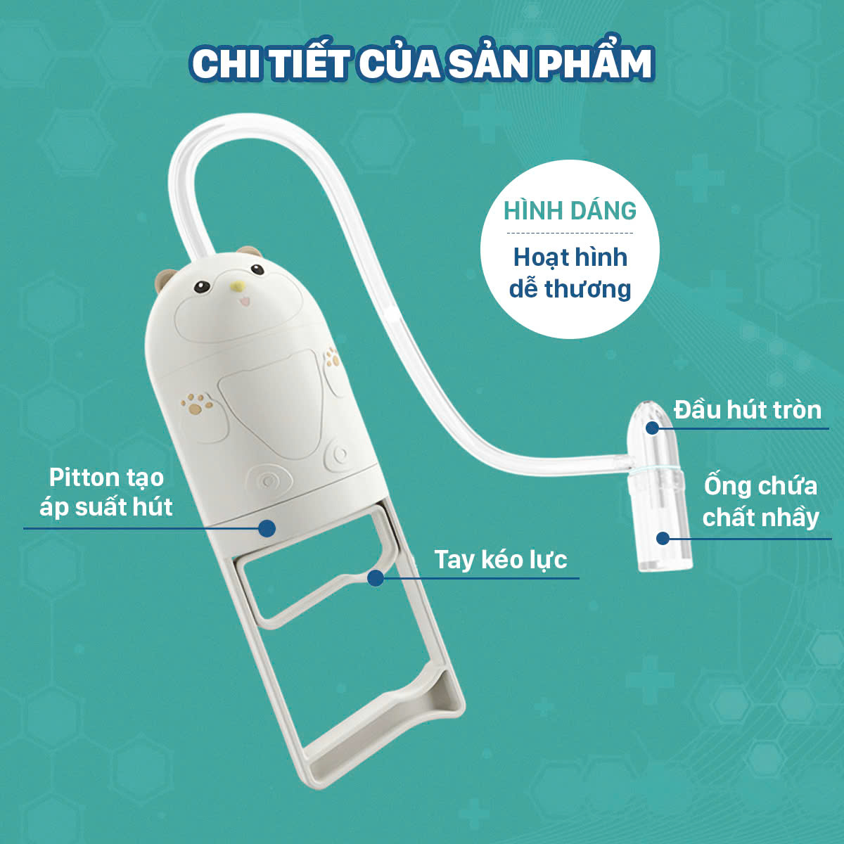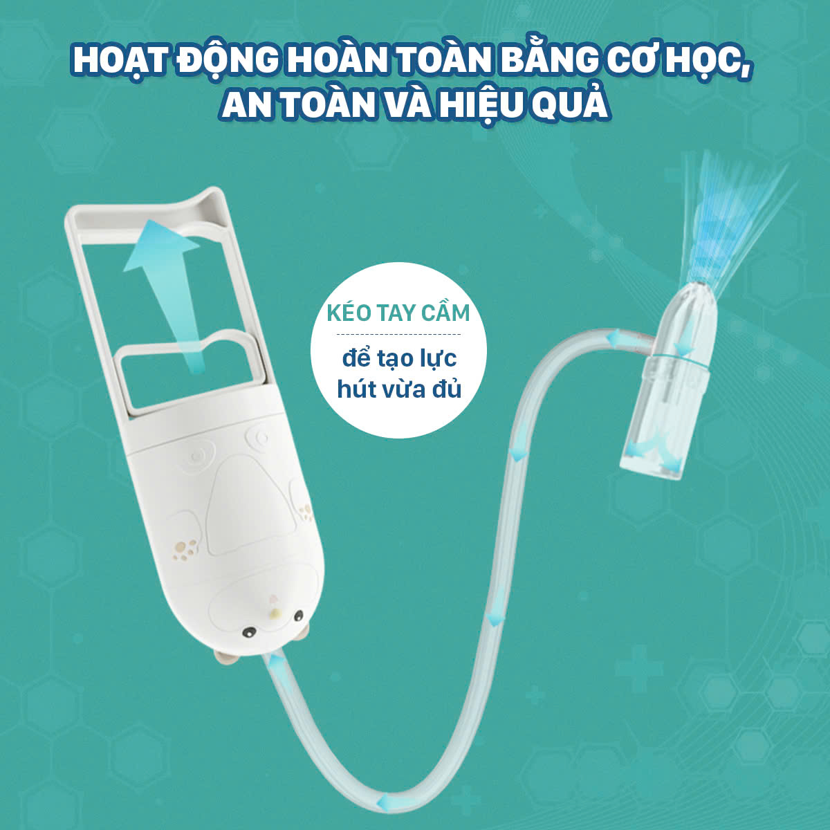 - Với thiết kế tay kéo tiện lợi, có thể dễ dàng điều chỉnh lực hút sao cho phù hợp với bé, chỉ cần kéo tay cầm, dụng cụ sẽ tạo ra lực hút vừa đủ để loại bỏ chất nhầy mà không cần sử dụng pin hay nguồn điện, rất an toàn và tiết kiệm chi phí