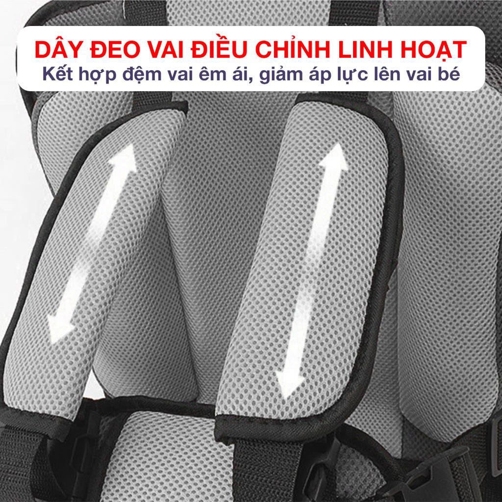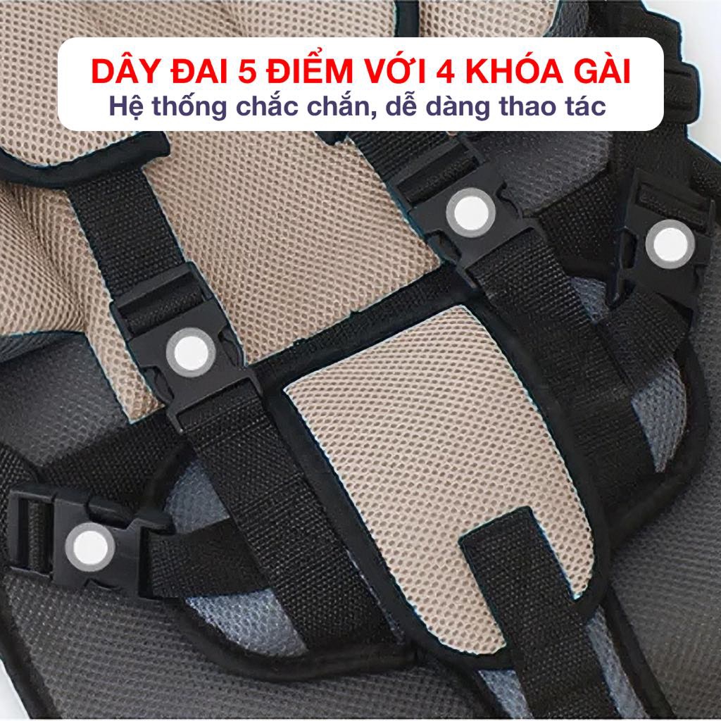 - Thiết kế hệ thống dây đai 5 điểm với 4 khóa gài chắc chắn, dễ dàng thao tác đeo/tháo, đảm bảo bé được cố định an toàn tuyệt đối
