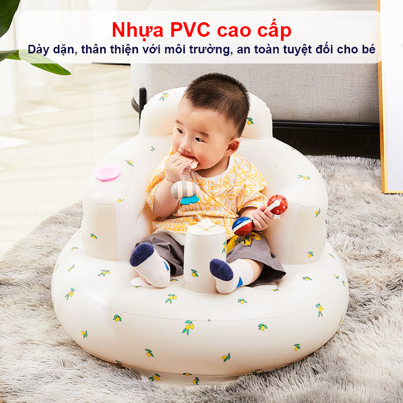 CHẤT LIỆU: Ghế hơi tập ngồi cho bé được làm từ chất liệu nhựa PVC cao cấp, dày dặn, thân thiện với môi trường và an toàn tuyết đối cho bé