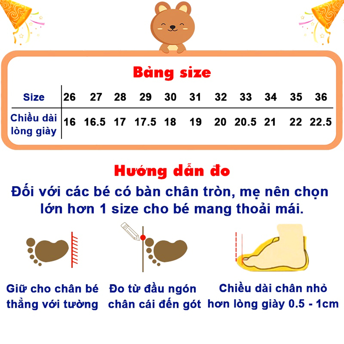 LƯU Ý: Để chọn size chính xác cho bé, mẹ vui lòng đo chiều dài chân bé từ gót đến ngón dài nhất theo chiều thẳng đứng. Đối với các bé có bàn chân tròn hoặc bề ngang rộng thì mẹ nên chọn lớn hơn 1 size cho bé mang thoải mái nhé. Mẹ nhanh tay sắm ngay cho bé 1 đôi để bé diện đi chơi nhé!