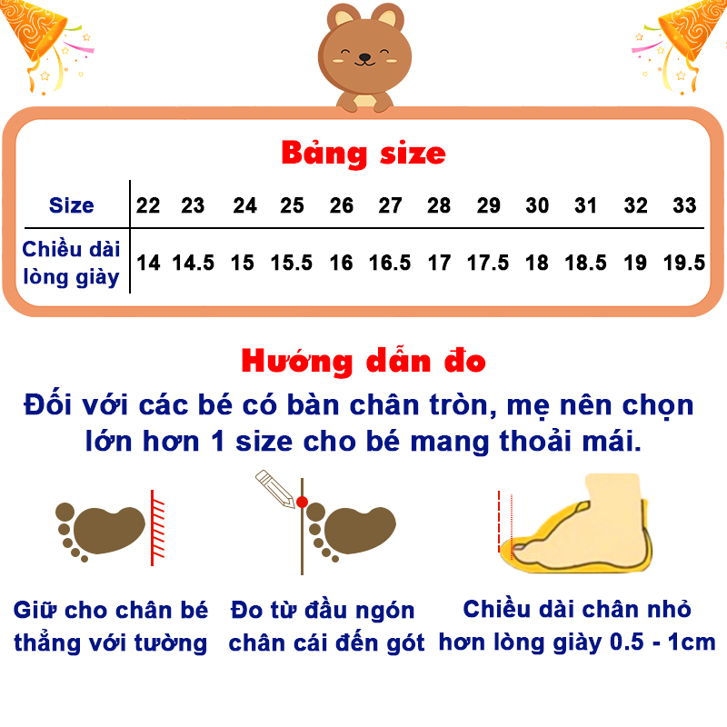 LƯU Ý: Để chọn size chính xác cho bé, mẹ vui lòng đo chiều dài chân bé từ gót đến ngón dài nhất theo chiều thẳng đứng. Đối với các bé có bàn chân tròn hoặc bề ngang rộng thì mẹ nên chọn lớn hơn 1 size cho bé mang thoải mái nhé.