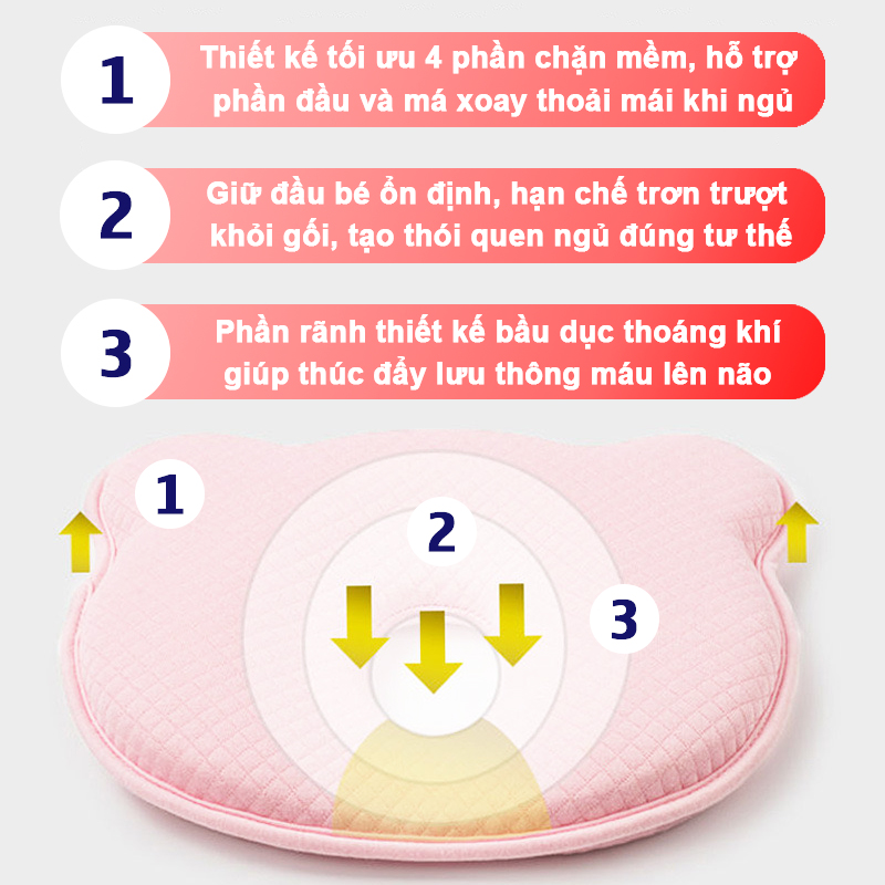 - Gối cao su non cho bé có cấu trúc ruột gối được thiết kế như một tổ ong khổng lồ, khi gối lên, không khí bên trong từ từ thoát ra ngoài, gối sẽ xẹp xuống ở một biên độ nhất định nhưng vẫn giữ được tính ổn định, CHỐNG LÕM ĐẦU tối đa cho bé, giúp bé có được giấc ngủ sâu