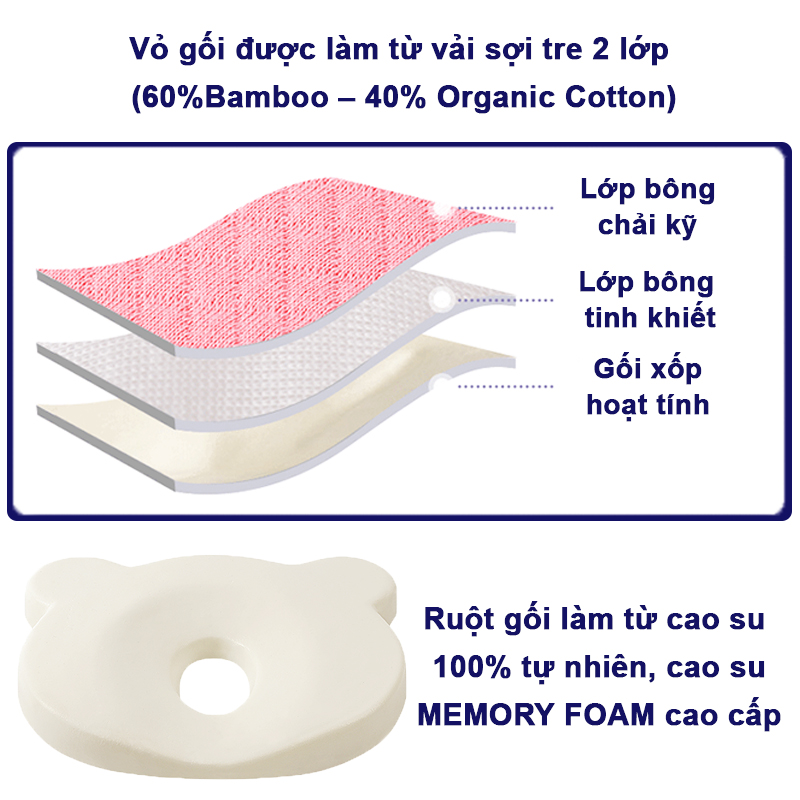 - Gối cao su non cho bé có vỏ gối được làm từ chất liệu VẢI SỢI TRE 2 lớp (60%Bamboo – 40% Organic Cotton) đang rất được các mẹ tin dùng hiện nay khi chọn mua quần áo cho con bởi tính THẤM HÚT TỐT hơn 60% so với vải cotton thông thường, có TÍNH KHÁNG KHUẨN TỰ NHIÊN, hạn chế tối đa mùi hôi, ẩm mốc, hơn nữa CHẤT VẢI RẤT MỀM MẠI, phù hợp với làn da nhạy cảm của bé