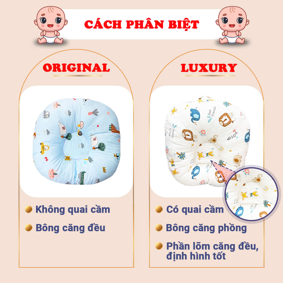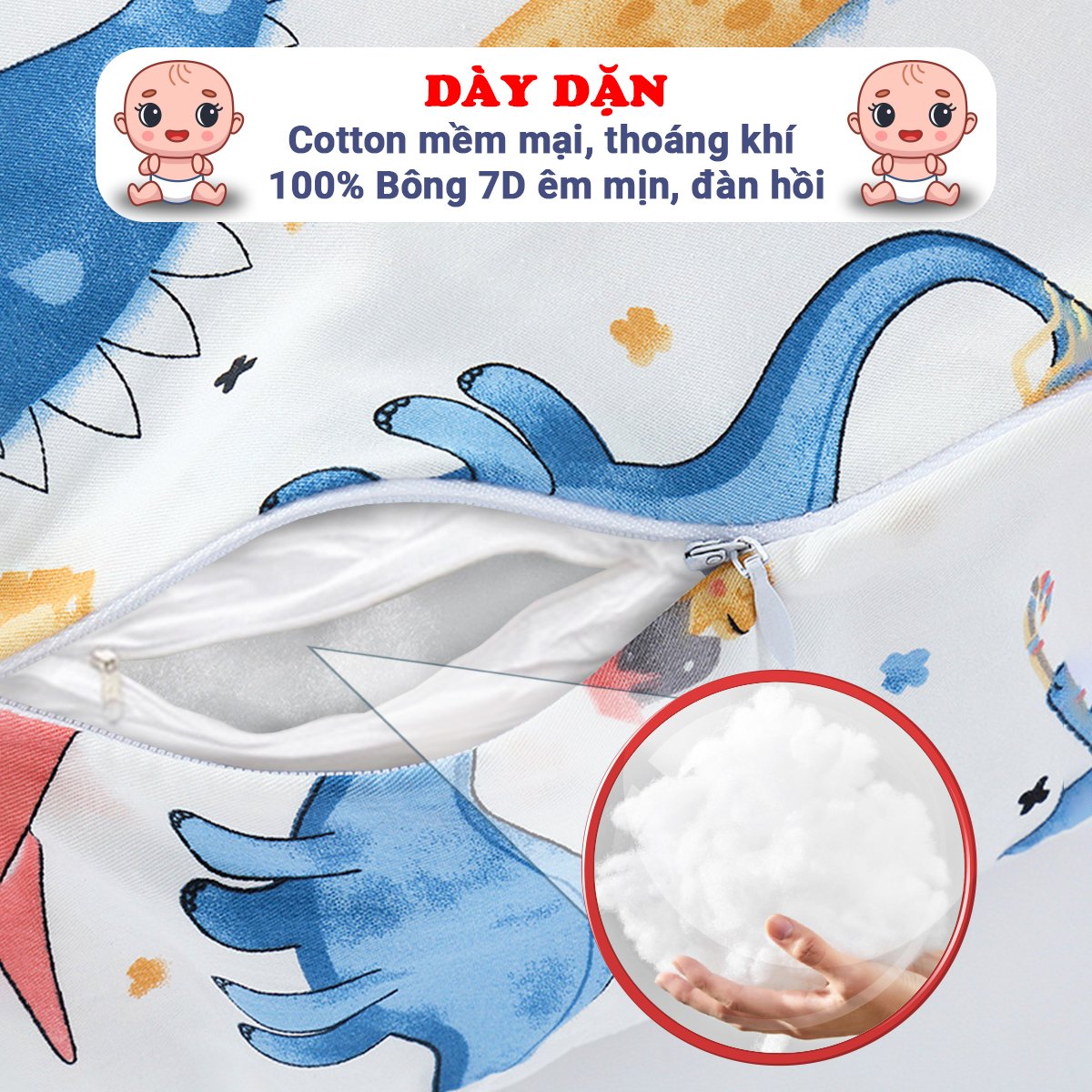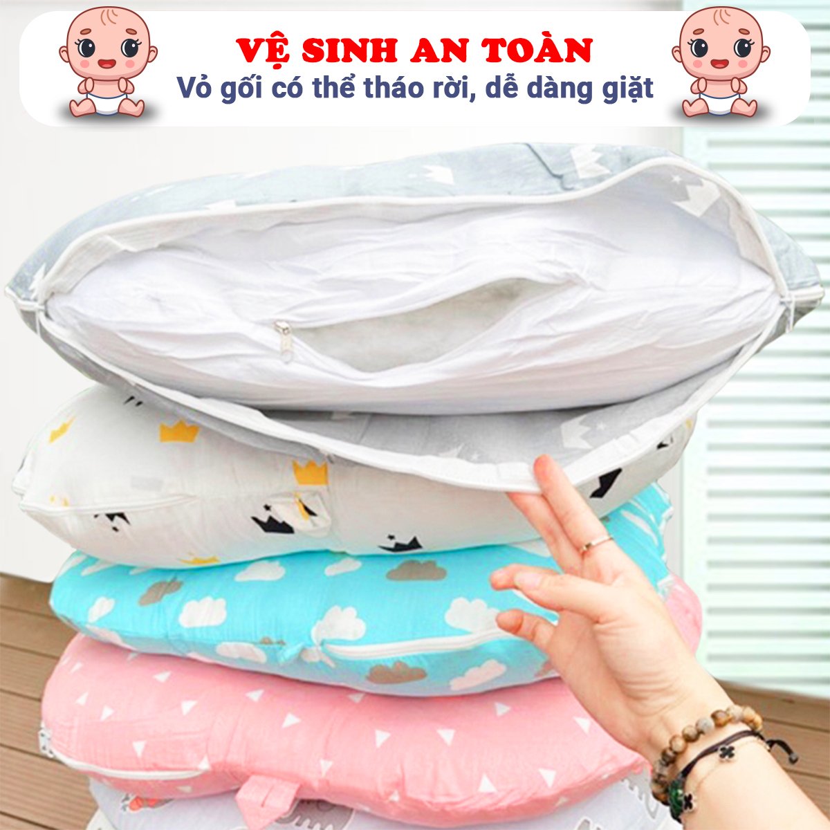 - Thiết kế khóa kéo hỗ trợ linh hoạt thêm bớt ruột gối để điều chỉnh độ dốc của gối cho phù hợp với bé