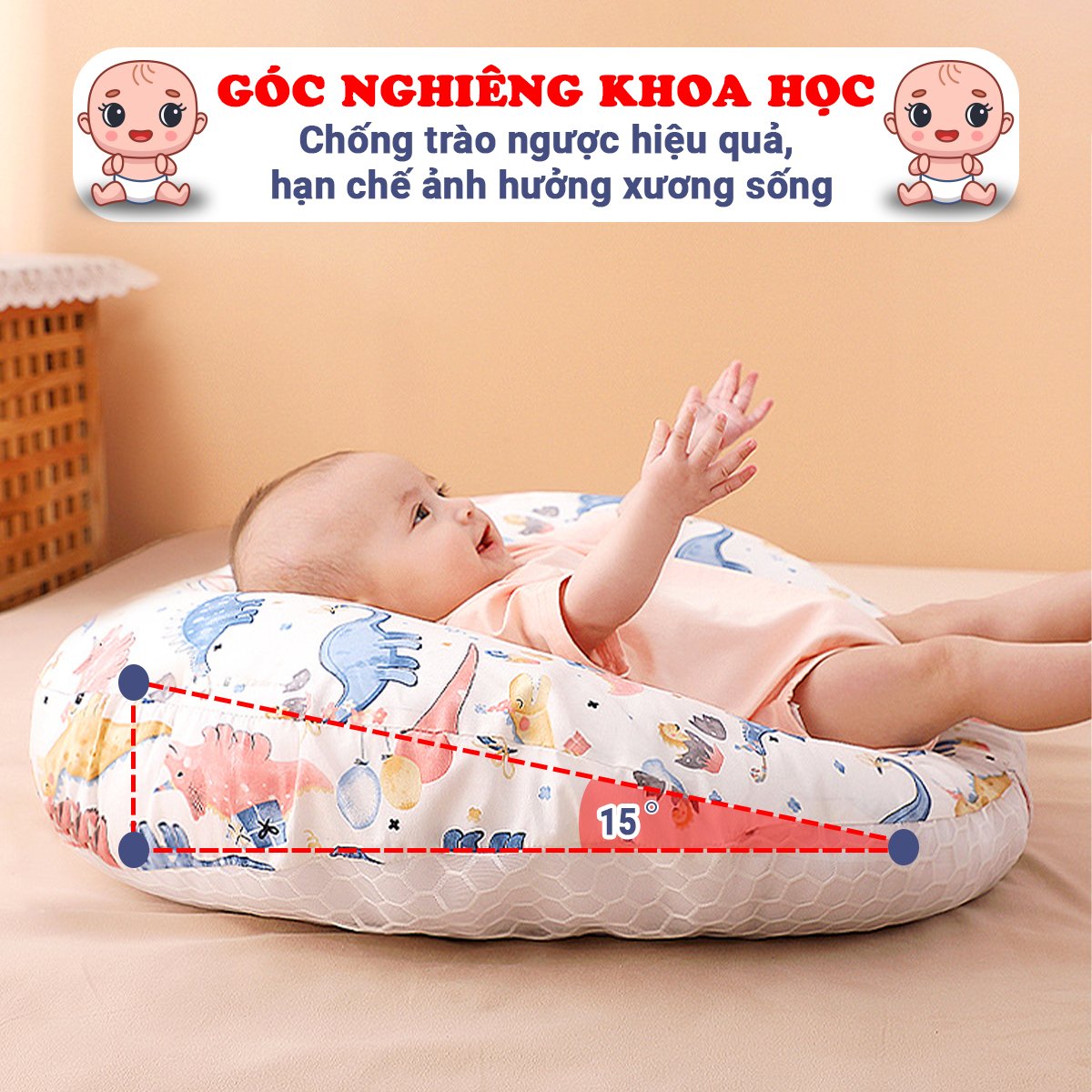 - Gối được thiết kế với độ dốc 15 độ được khoa học chứng minh giúp chống trào hiệu quả, đồng thời hạn chế ảnh hưởng đến sự phát triển xương sống của bé