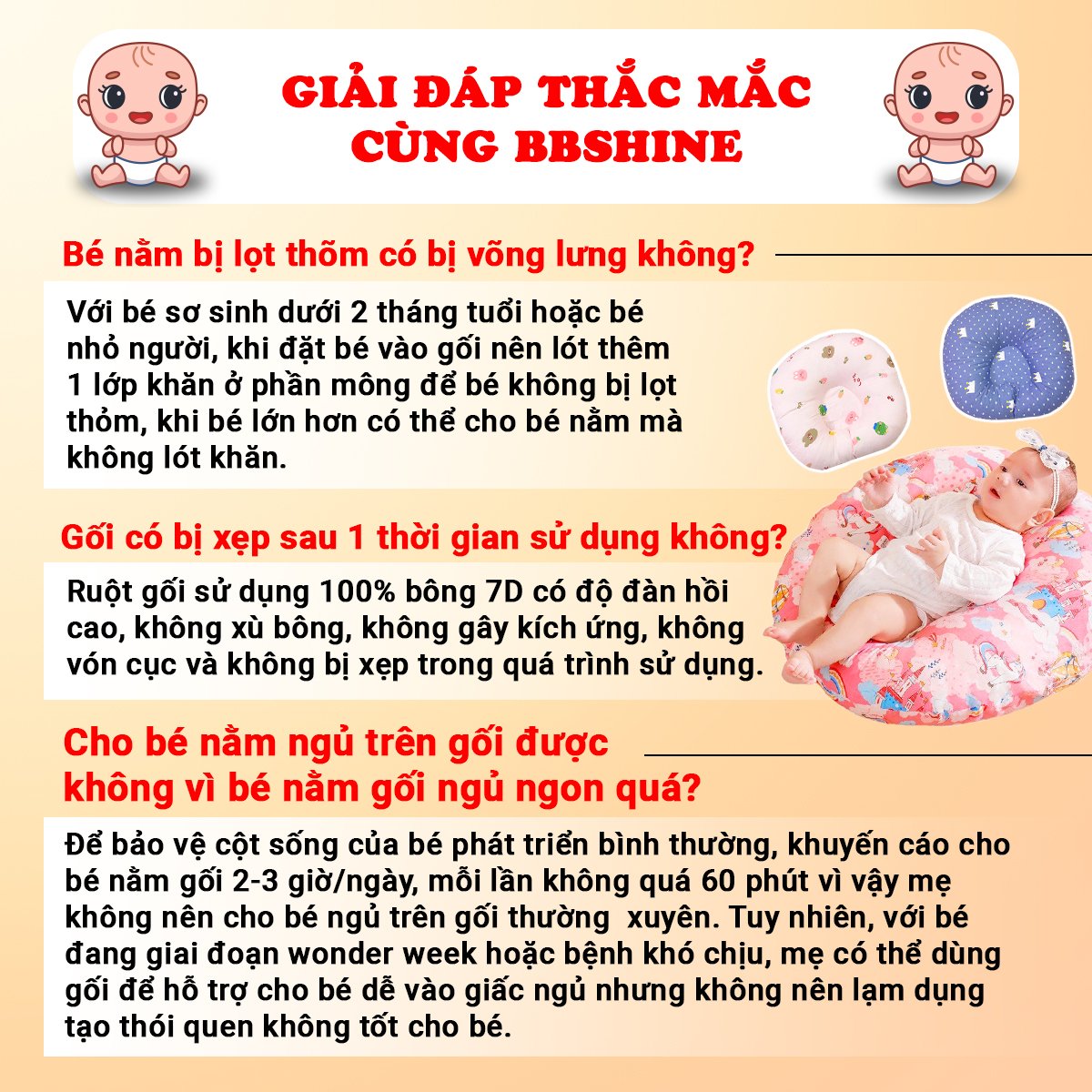 - Để hạn chế tối đa ảnh hưởng đến cột sống của bé: Cho bé nằm gối dưới 4 giờ/ngày với bé 0-6 tháng tuổi