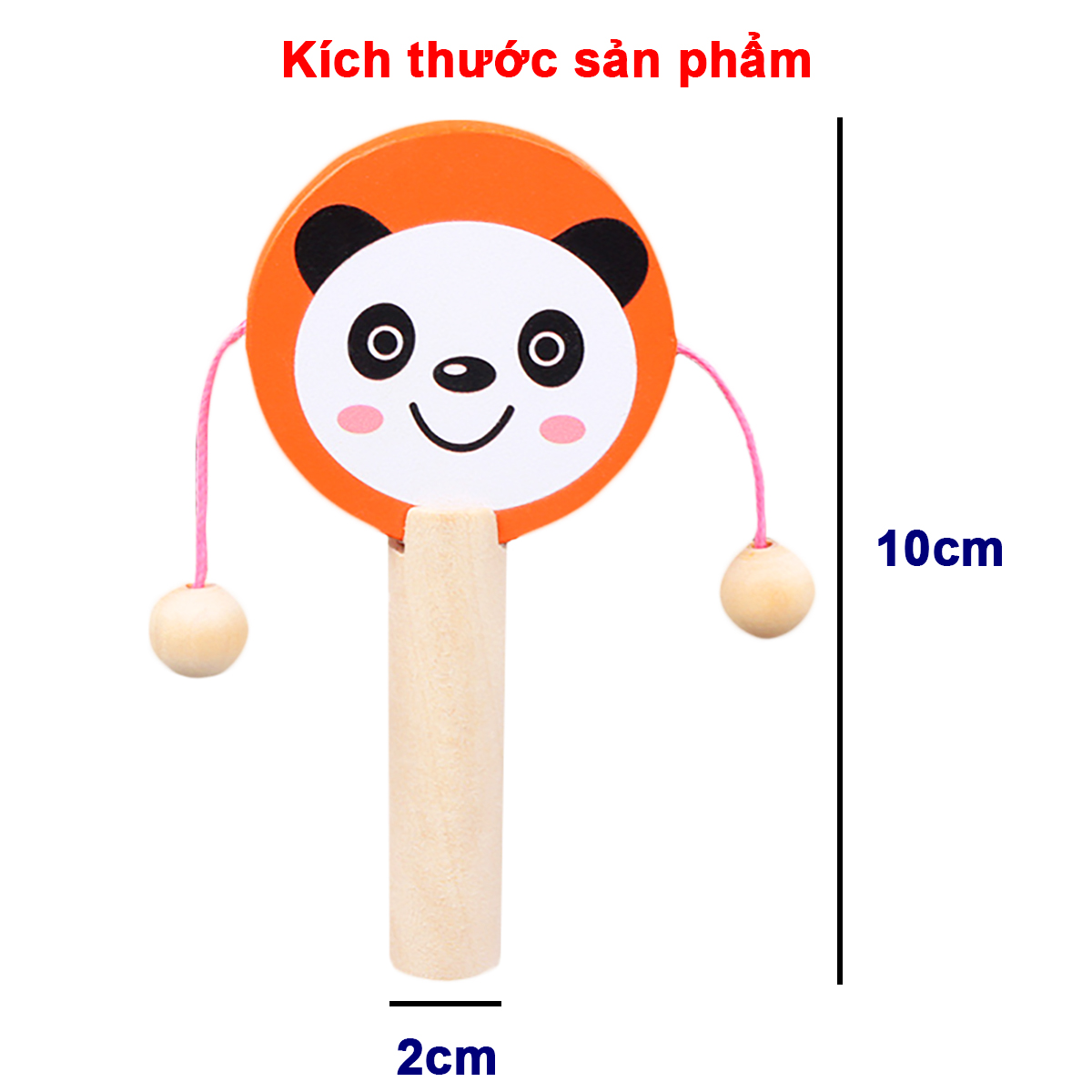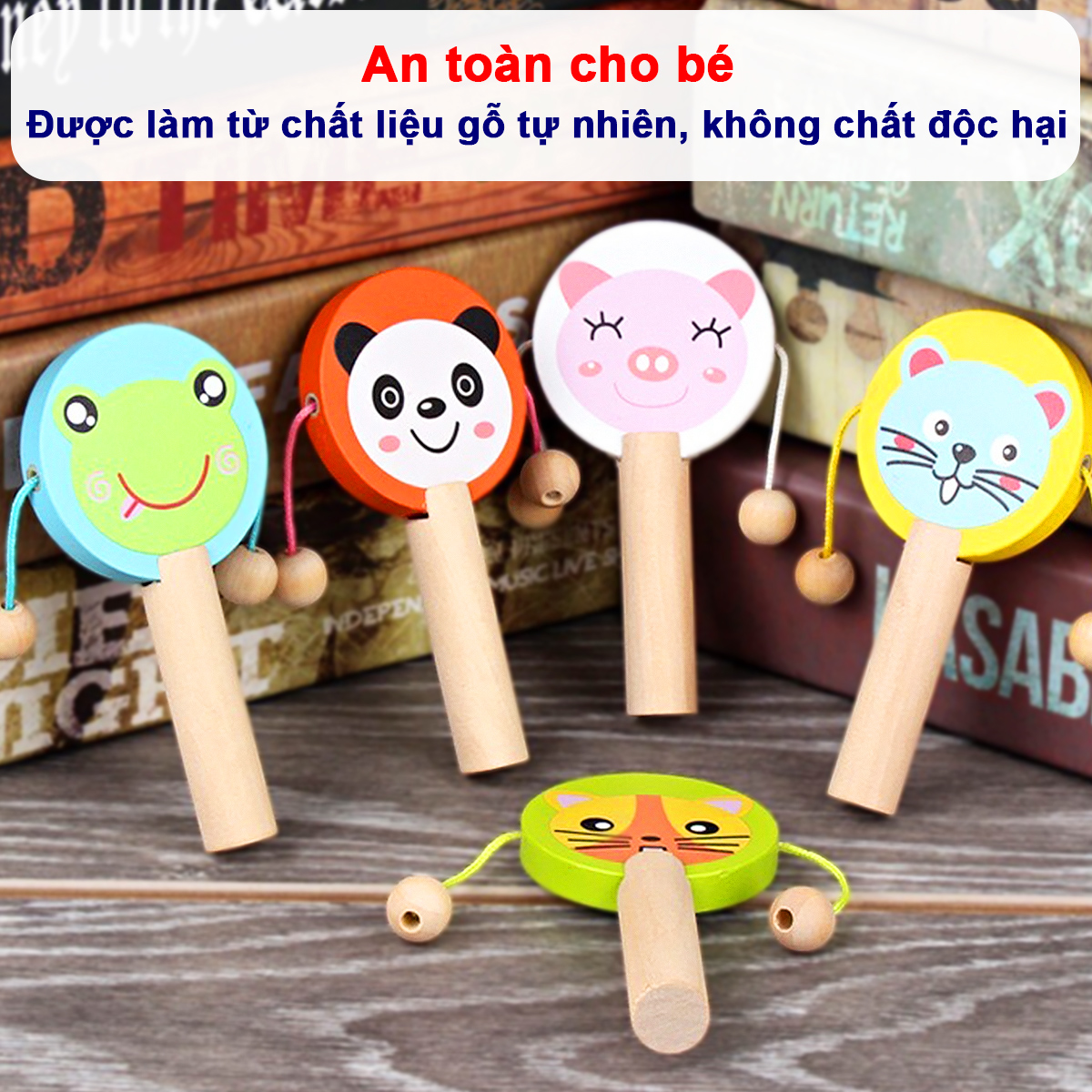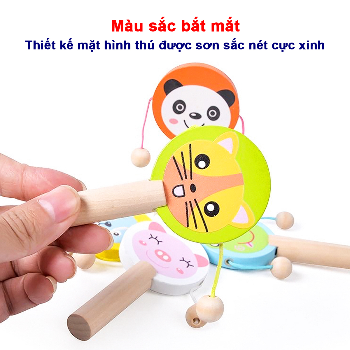 Đồ chơi gỗ, Trống lắc hình thú ngộ nghĩnh đủ màu sắc cho bé làm quen với âm thanh hỗ trợ sự phát triển của bé, kích thích thính giác và khả năng cảm nhận âm thanh của bé, từ đó tăng khả năng sáng tạo, hỗ trợ sự phát triển não bộ của trẻ