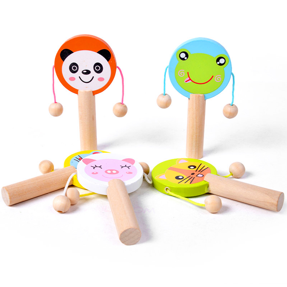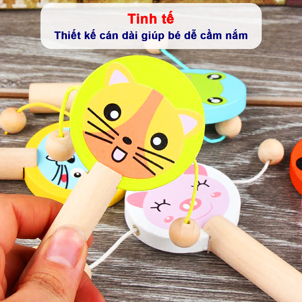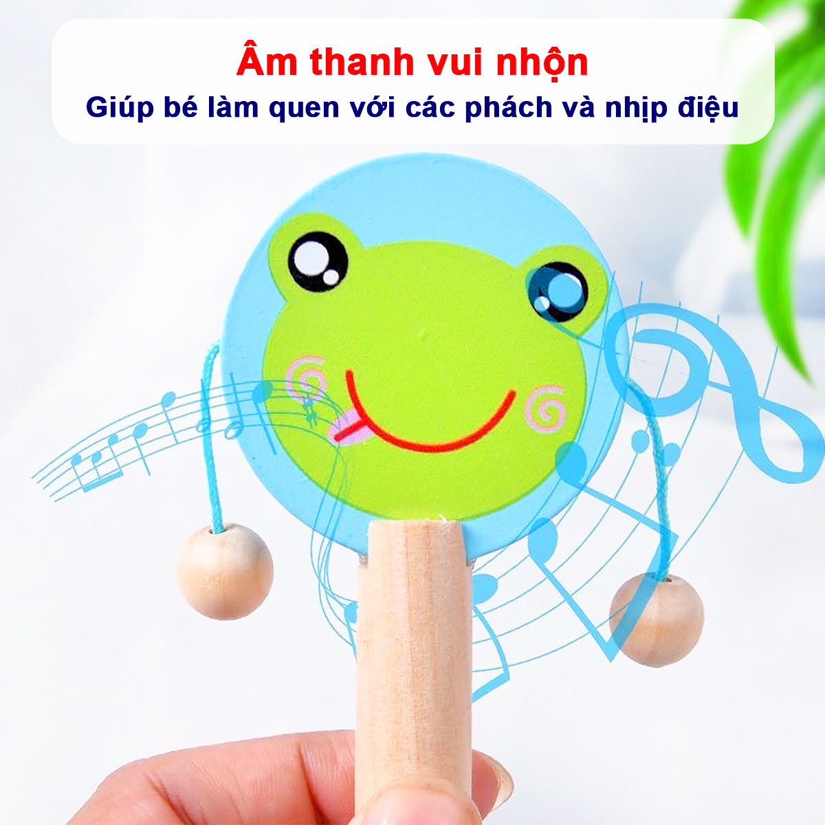 Đồ chơi gỗ, Trống lắc hình thú ngộ nghĩnh đủ màu sắc cho bé làm quen với âm thanh hỗ trợ sự phát triển của bé, kích thích thính giác và khả năng cảm nhận âm thanh của bé, từ đó tăng khả năng sáng tạo, hỗ trợ sự phát triển não bộ của trẻ