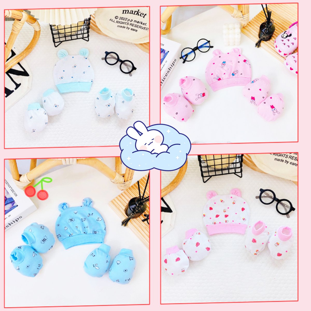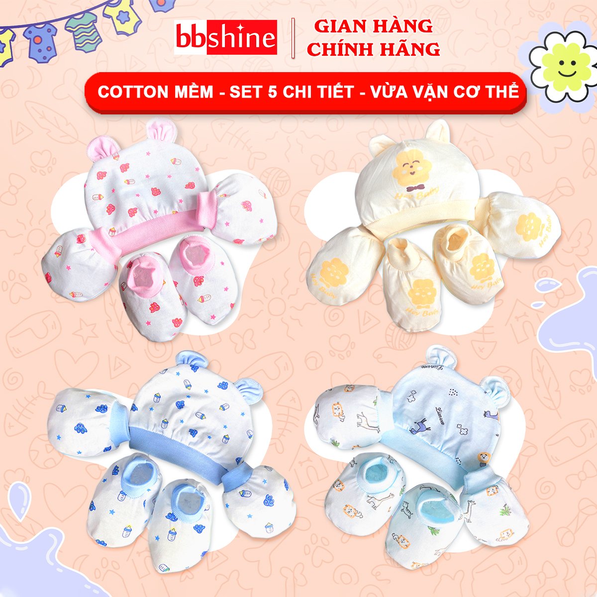Mũ sơ sinh, Set bao tay chân mũ sơ sinh chất cotton cao cấp 5 chi tiết nhiều họa tiết xinh xắn cho bé