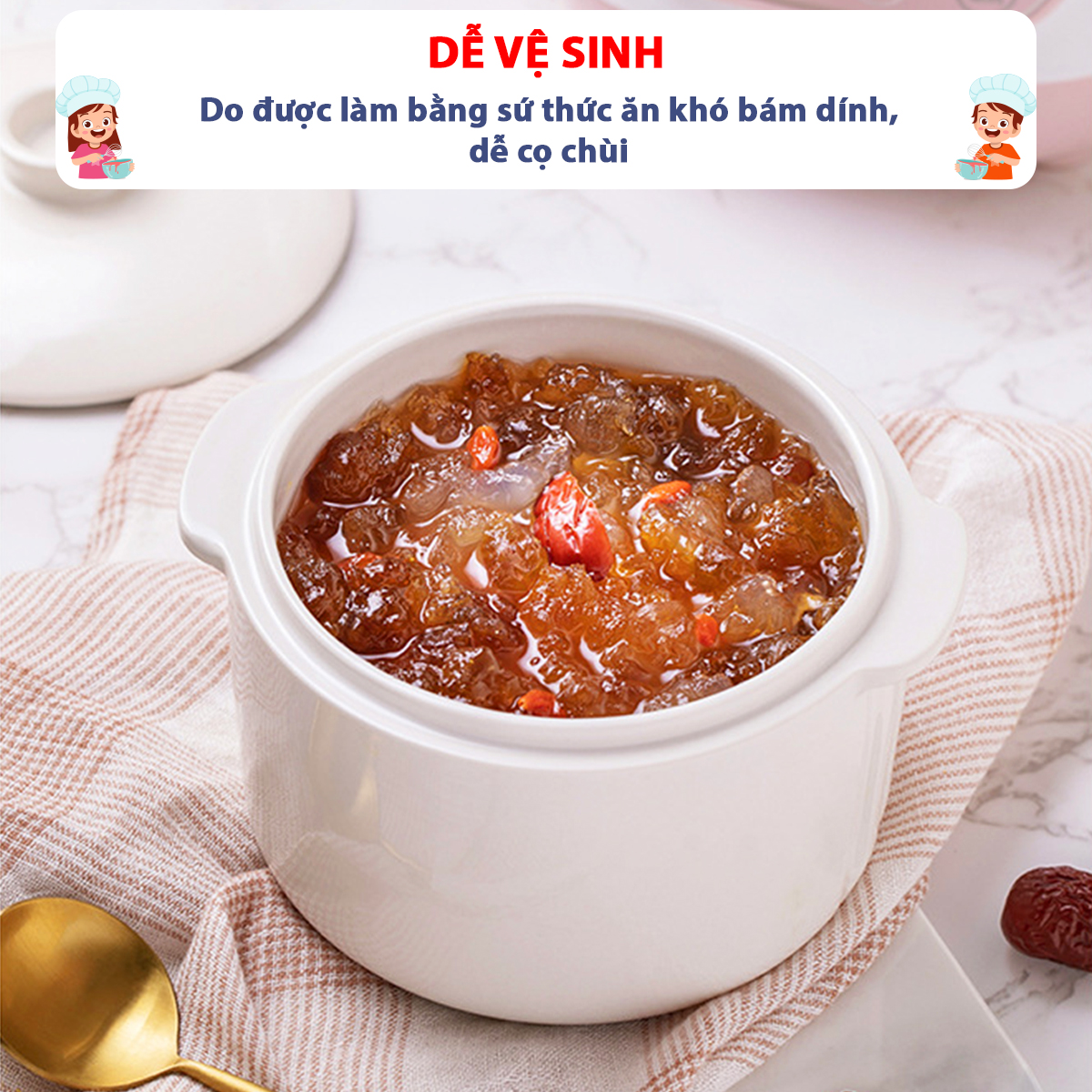 - Dễ vệ sinh: Lòng nồi sứ không bám dính, dễ lau chùi
