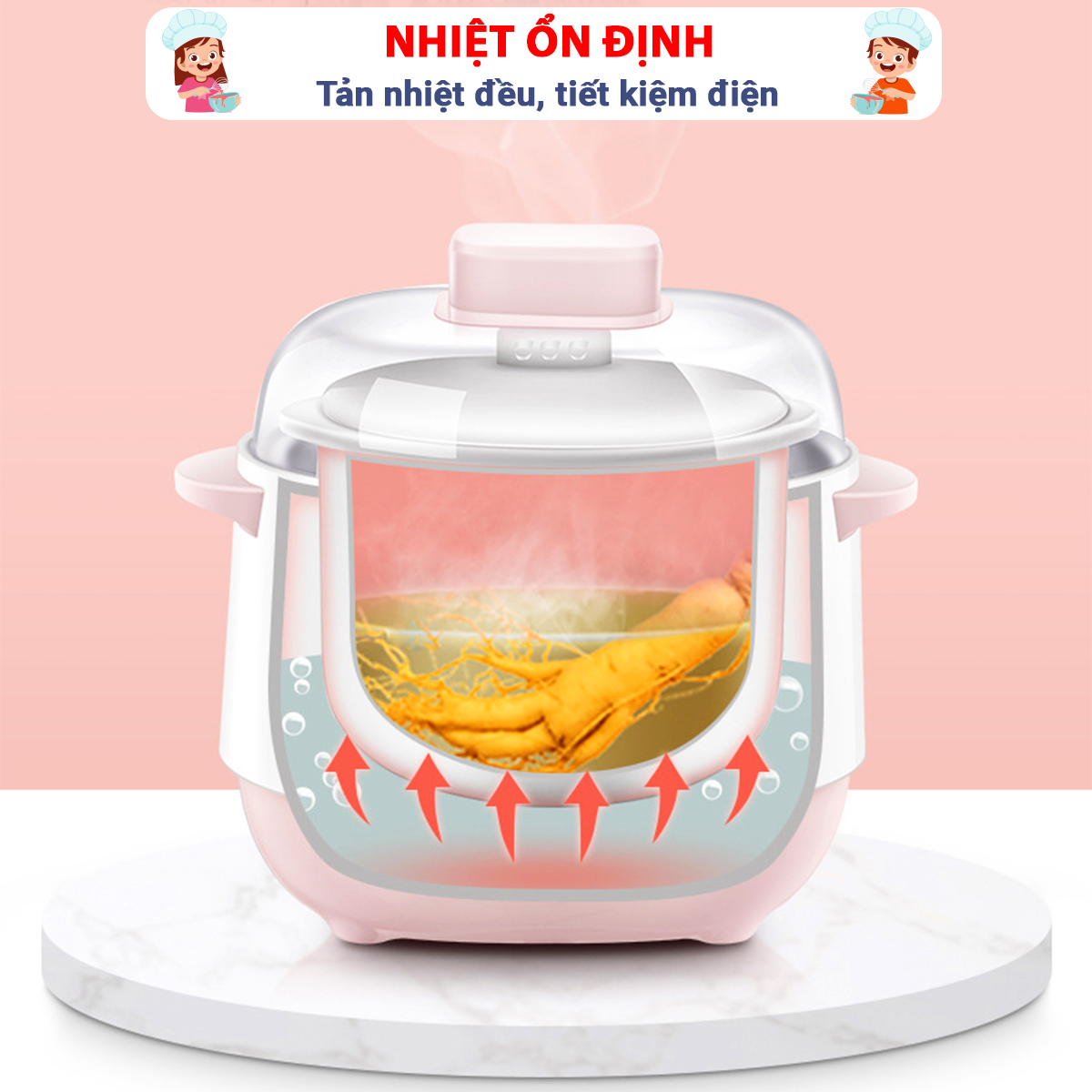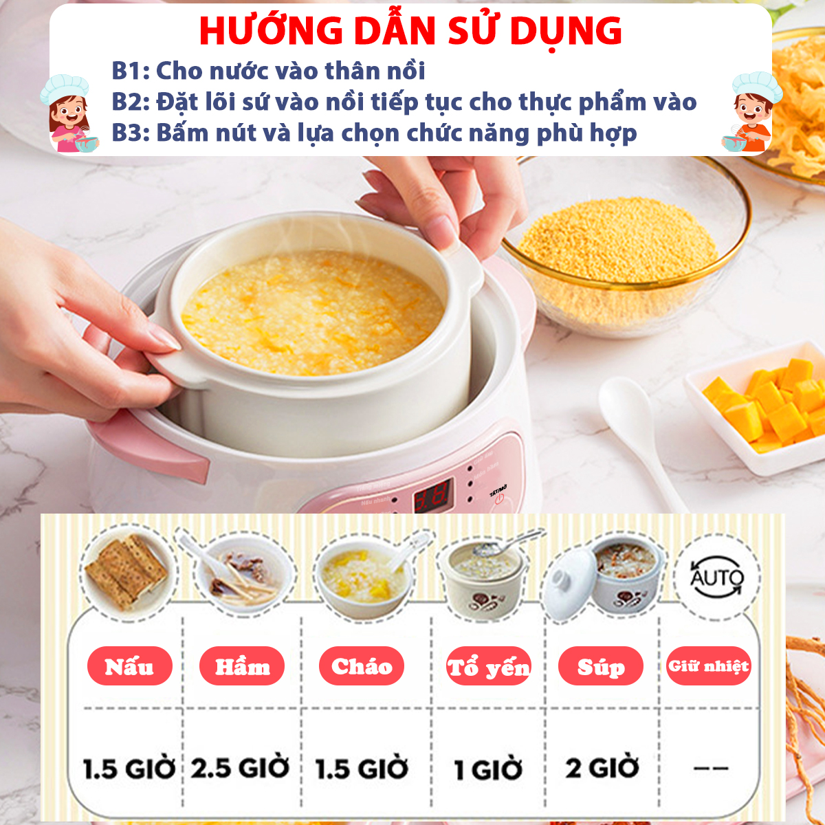 - Có 6 chức năng: Hấp, hầm canh, nấu cháo, chưng yến, súp chè, giữ ấm