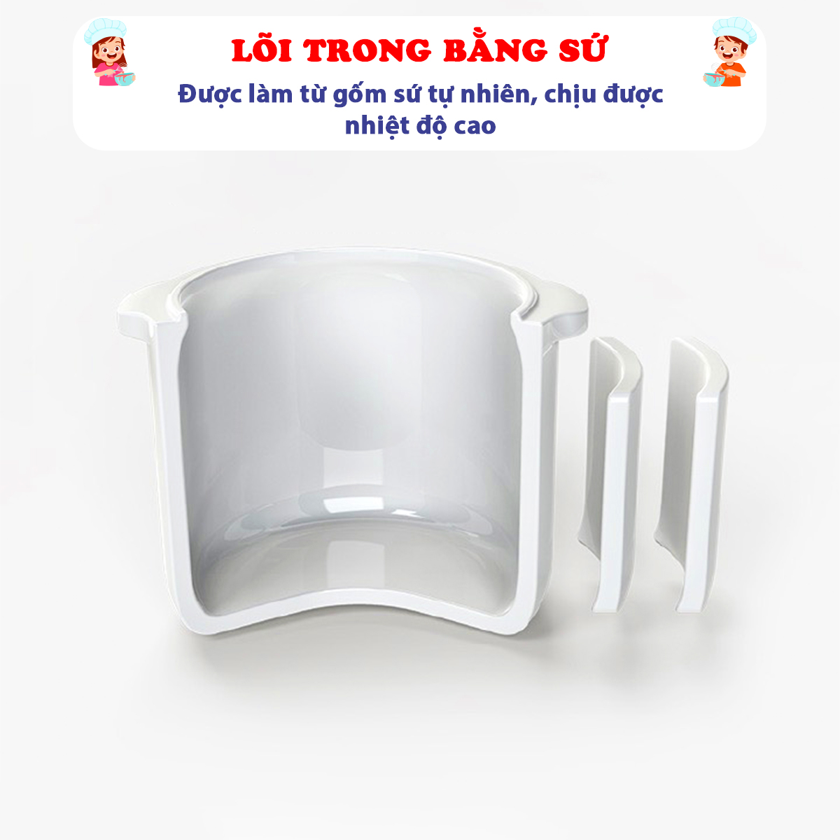 ĐẶC ĐIỂM: Thiết kế vỏ ngoài làm bằng nhựa ABS cao cấp, ruột nồi được làm bằng sứ tráng men, không nhiễm chì, không chứa chất độc hại