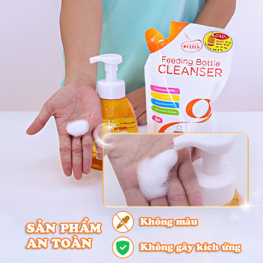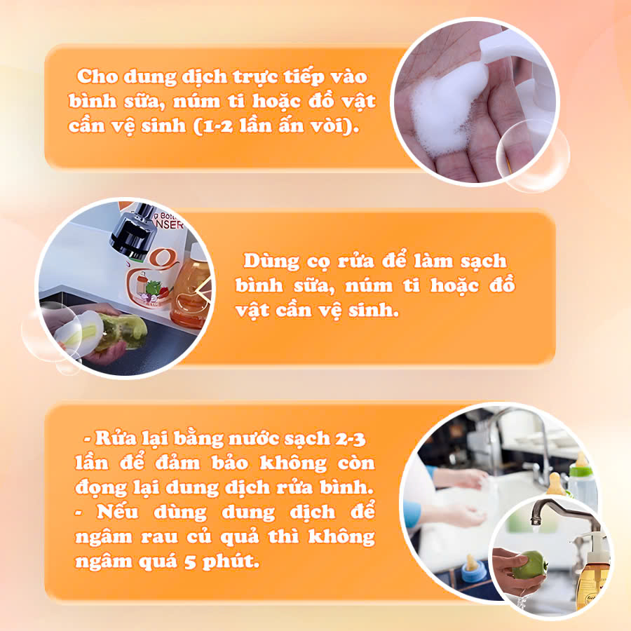 - Cho vừa đủ lượng dung dịch vào bông tẩy rửa cùng một ít nước ấm và chùi rửa bình sữa cũng như các dụng cụ cho bé ăn khác hoặc chai tạo bọt rồi vệ sinh kỹ bình sữa, núm ti để loại bỏ vết bẩn, mùi hôi