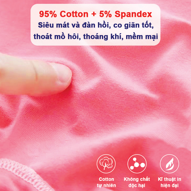 - Quần chip bé gái được làm từ 95% Cotton siêu mát + 5% Spandex (chất liệu siêu đàn hồi) giúp co giãn tối đa, thoát mồ hôi, thoáng khí và mềm mại