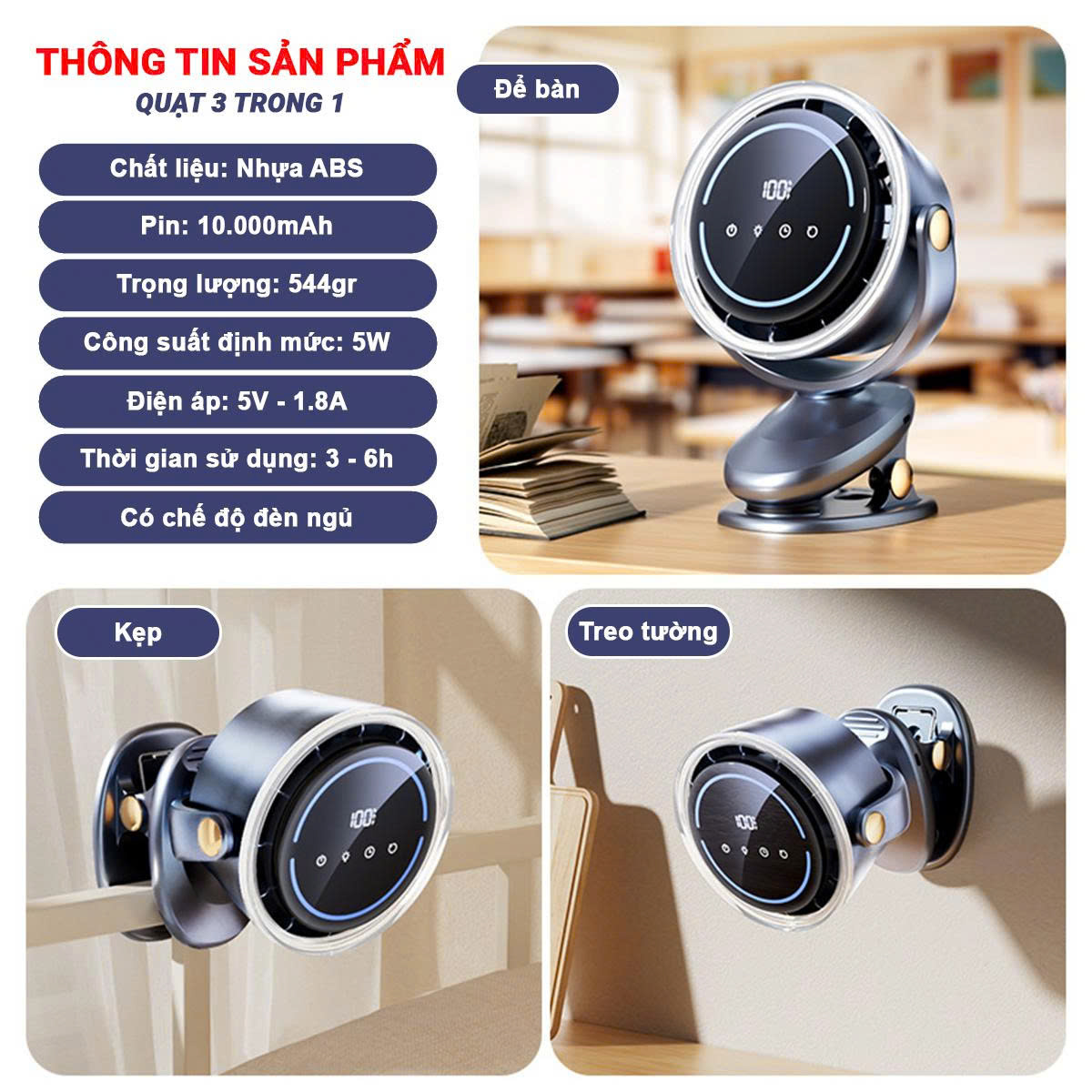 QUY CÁCH ĐÓNG GÓI: Hộp - Gồm 1 quạt + 1 cáp sạc + 1 móc treo