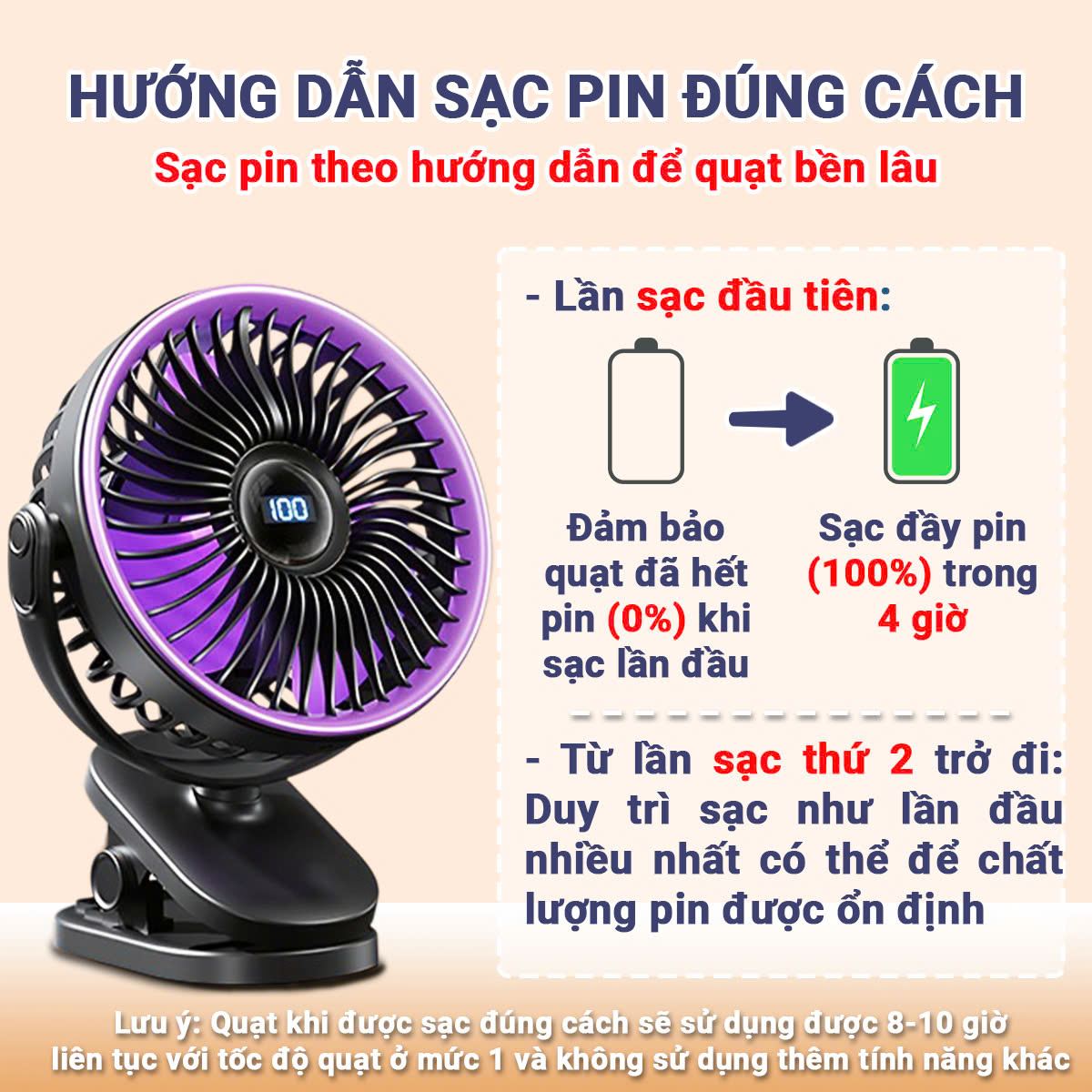 LƯU Ý: Dung lượng pin ở lần đầu sử dụng khi mở quạt sẽ là pin ảo nên khi mua quạt cần xả pin để quạt được sử dụng bền và ổn định hơn.