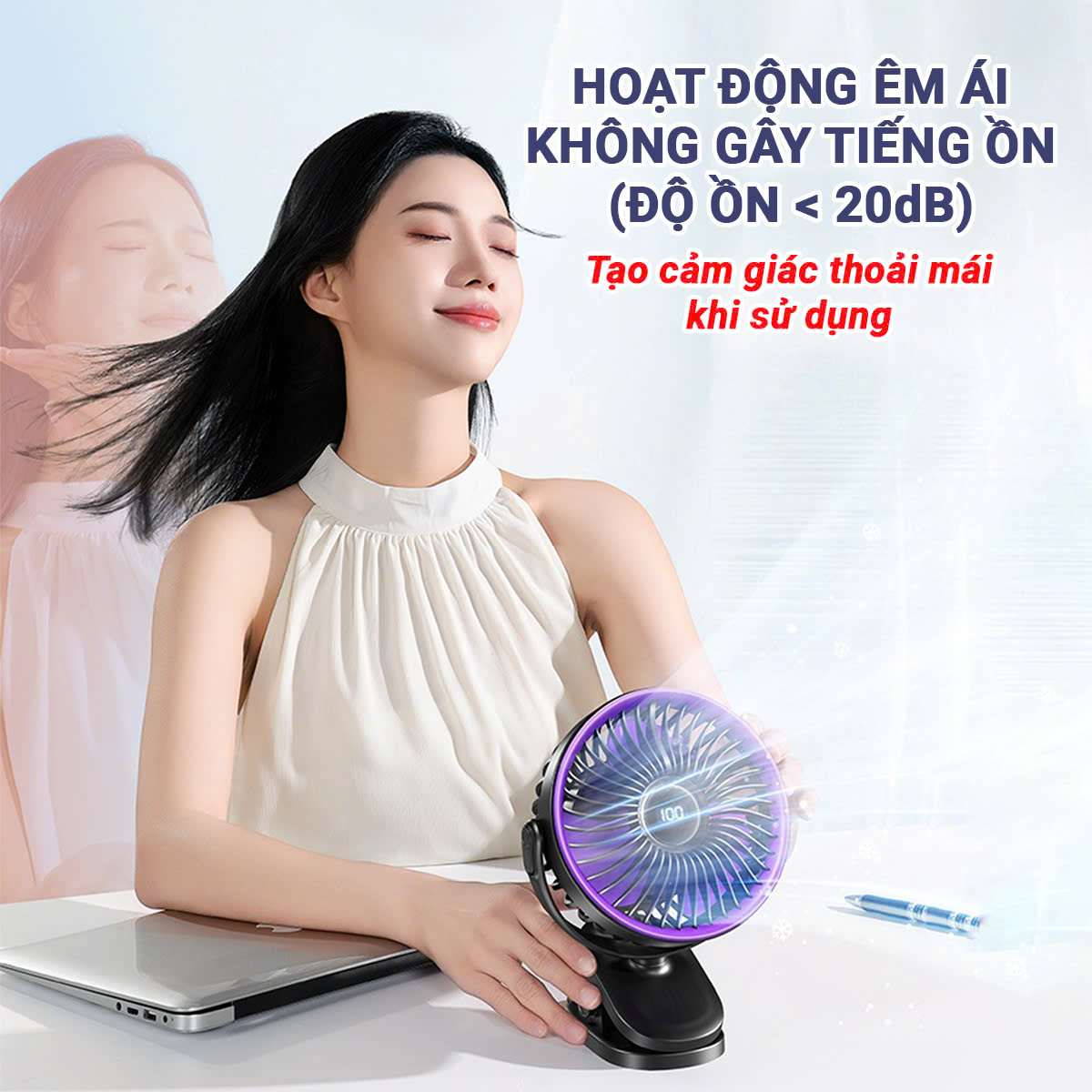 - Phần đế được thiết kế đặc biệt để có thể kẹp chắc chắn vào bàn làm việc, đầu giường, xe đẩy em bé, giúp bạn rảnh tay và tận hưởng làn gió mát mọi lúc mọi nơi