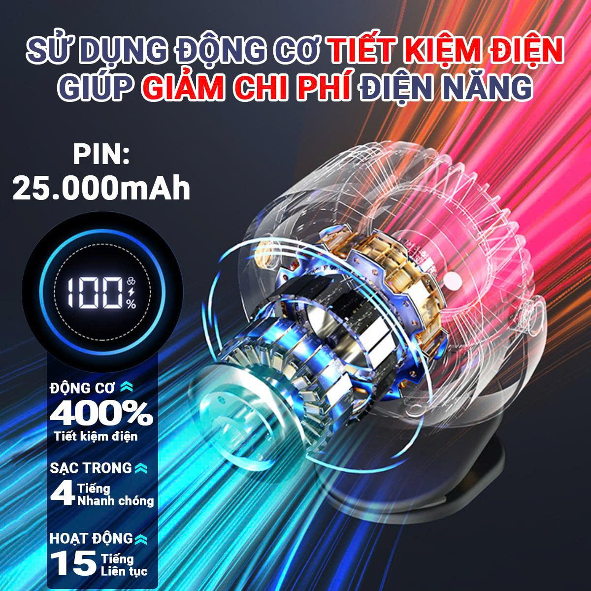 + 25.000mAh sạc đầy trong 6h, hoạt động liên tục đến 15h