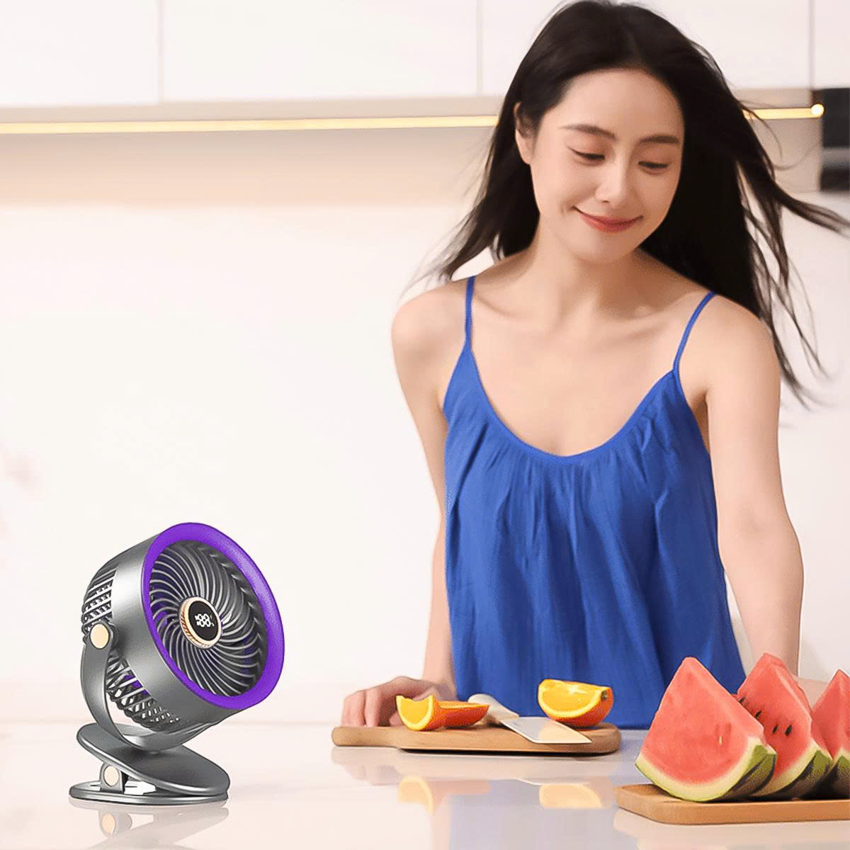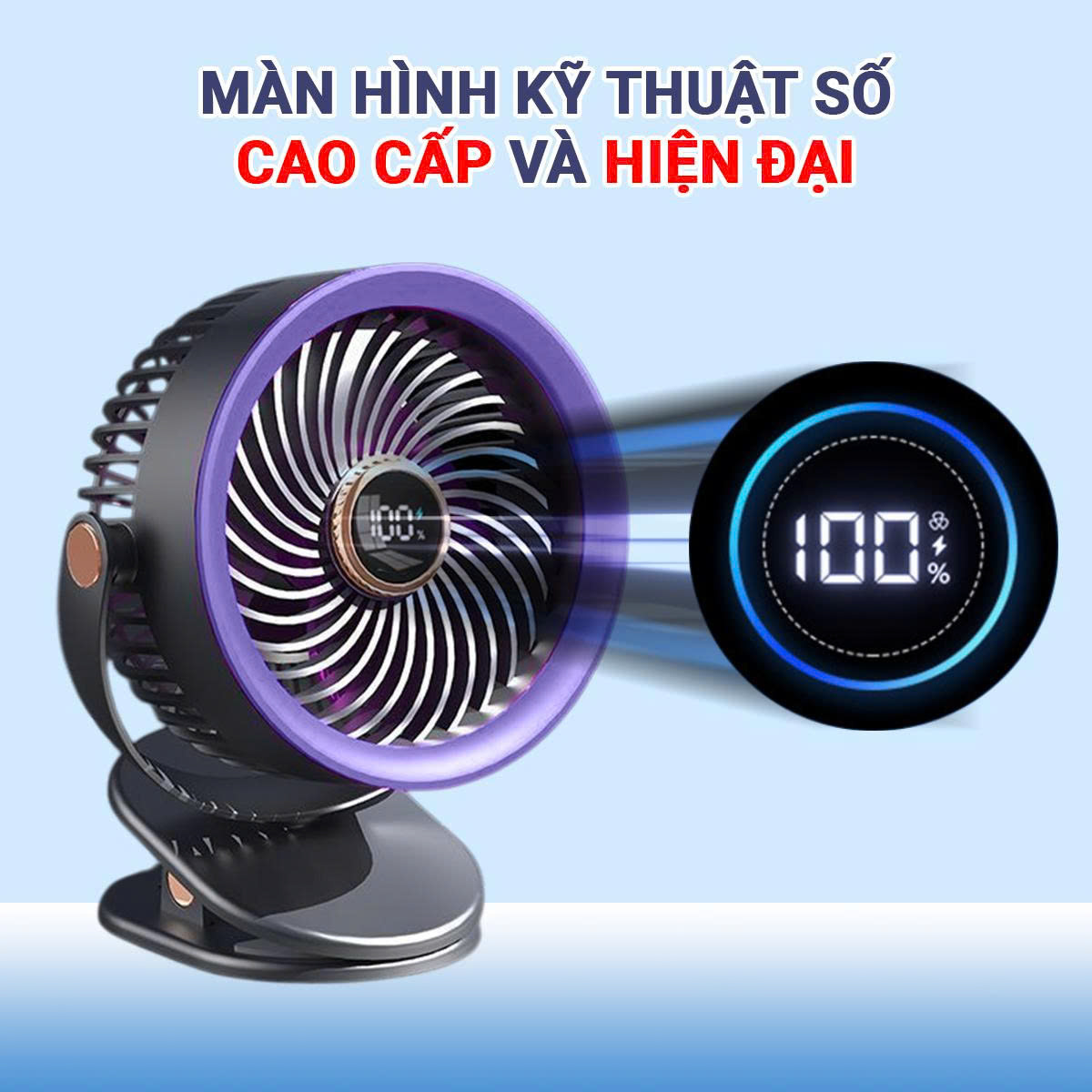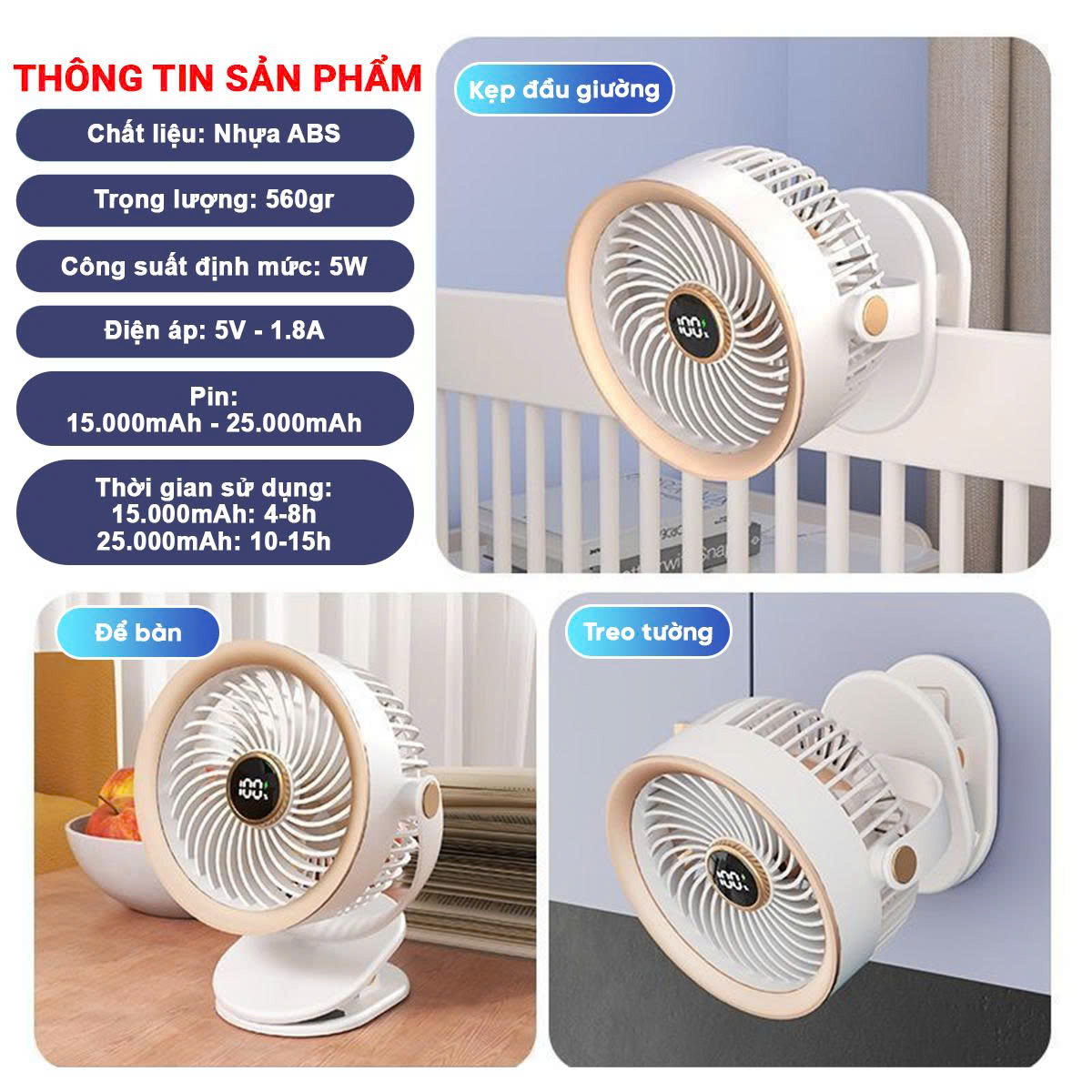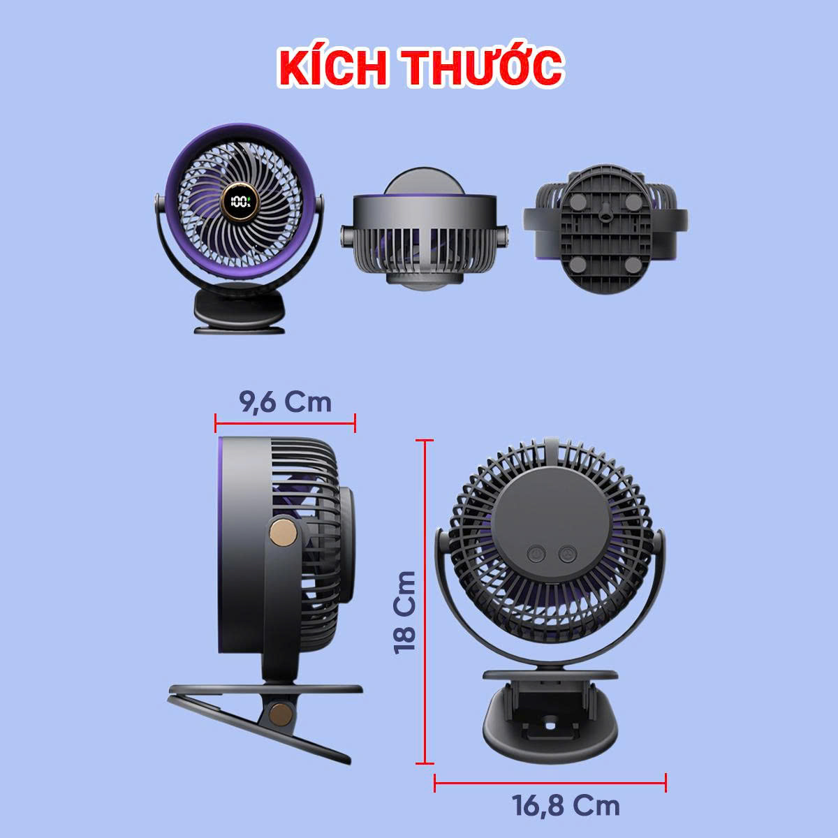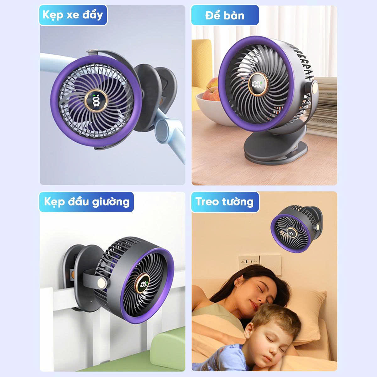 - Phần đế được thiết kế đặc biệt để có thể kẹp chắc chắn vào bàn làm việc, đầu giường, xe đẩy em bé, giúp bạn rảnh tay và tận hưởng làn gió mát mọi lúc mọi nơi