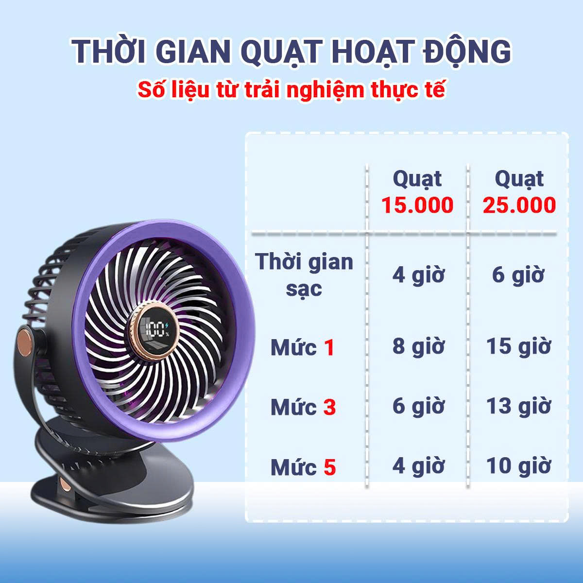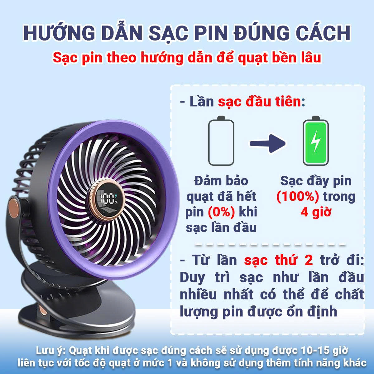 LƯU Ý: Dung lượng pin ở lần đầu sử dụng khi mở quạt sẽ là pin ảo nên khi mua quạt cần xả pin để quạt được sử dụng bền và ổn định hơn.