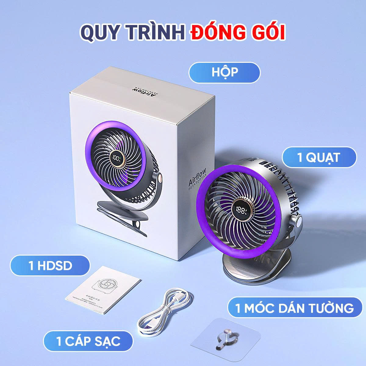 QUY CÁCH ĐÓNG GÓI: Hộp - Gồm 1 quạt + 1 cáp sạc + 1 HDSD + 1 móc dán tường