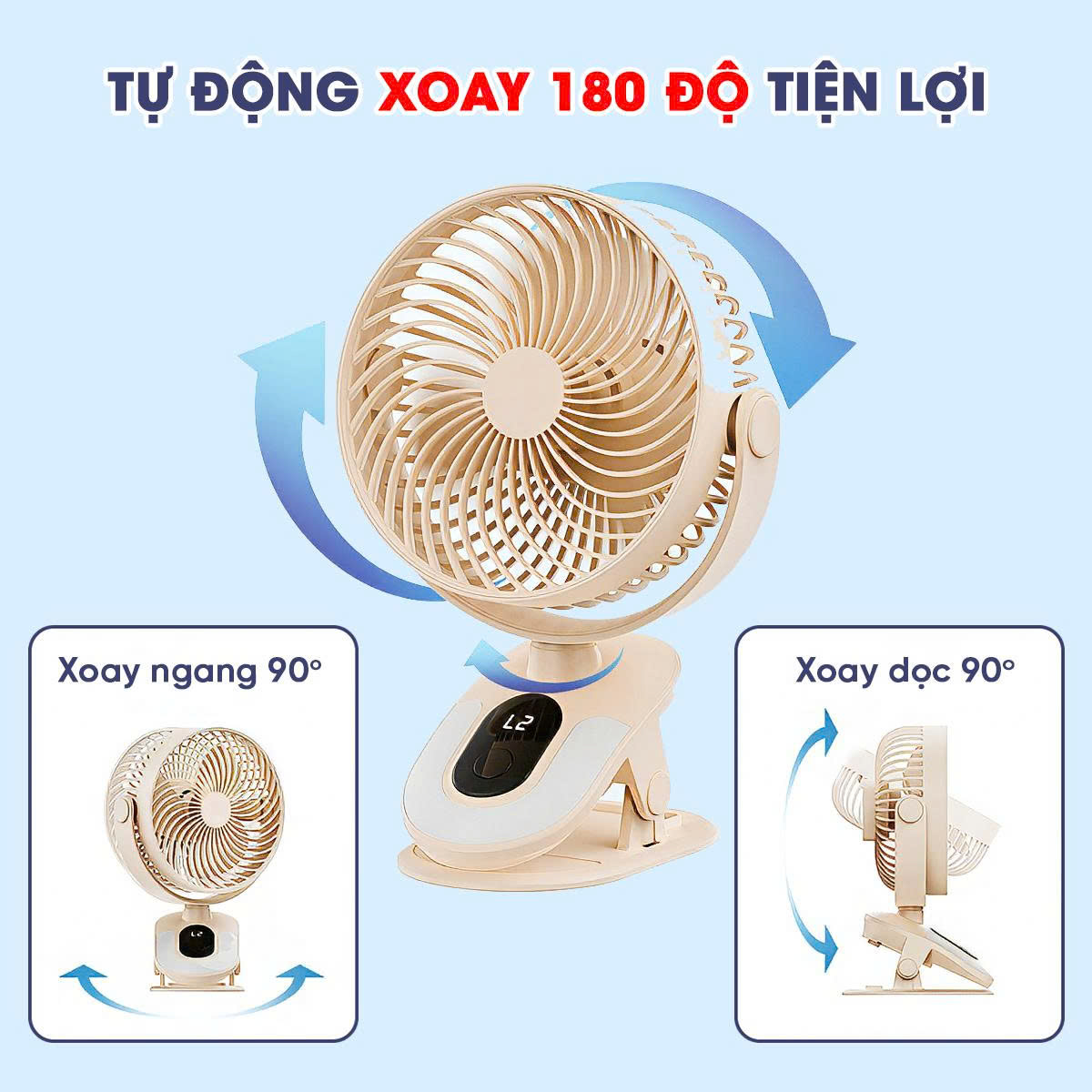 - Quạt có thể xoay 180 độ giúp dễ dàng điều chỉnh hướng gió theo nhu cầu sử dụng