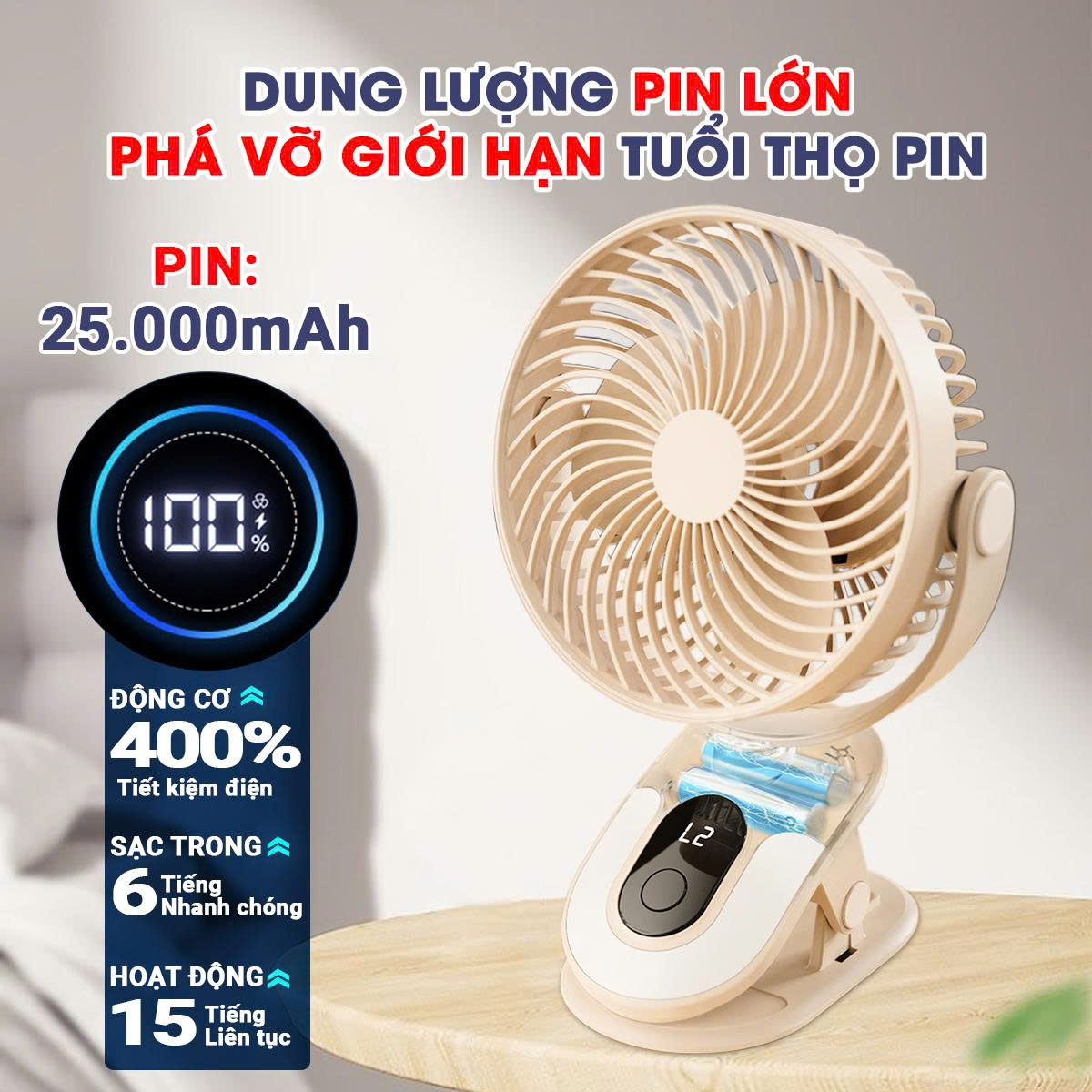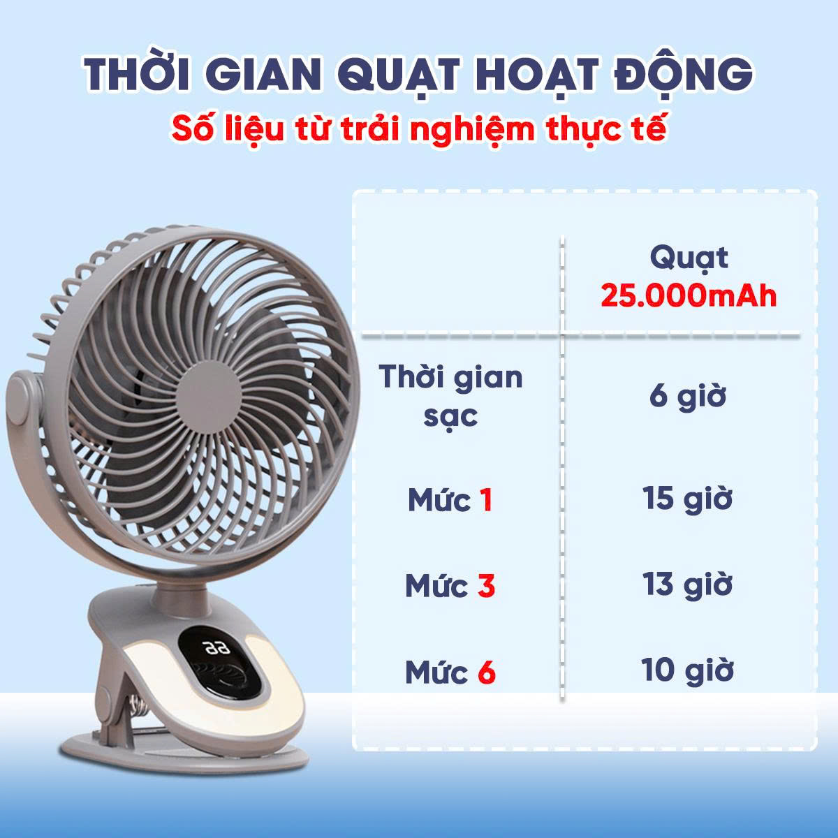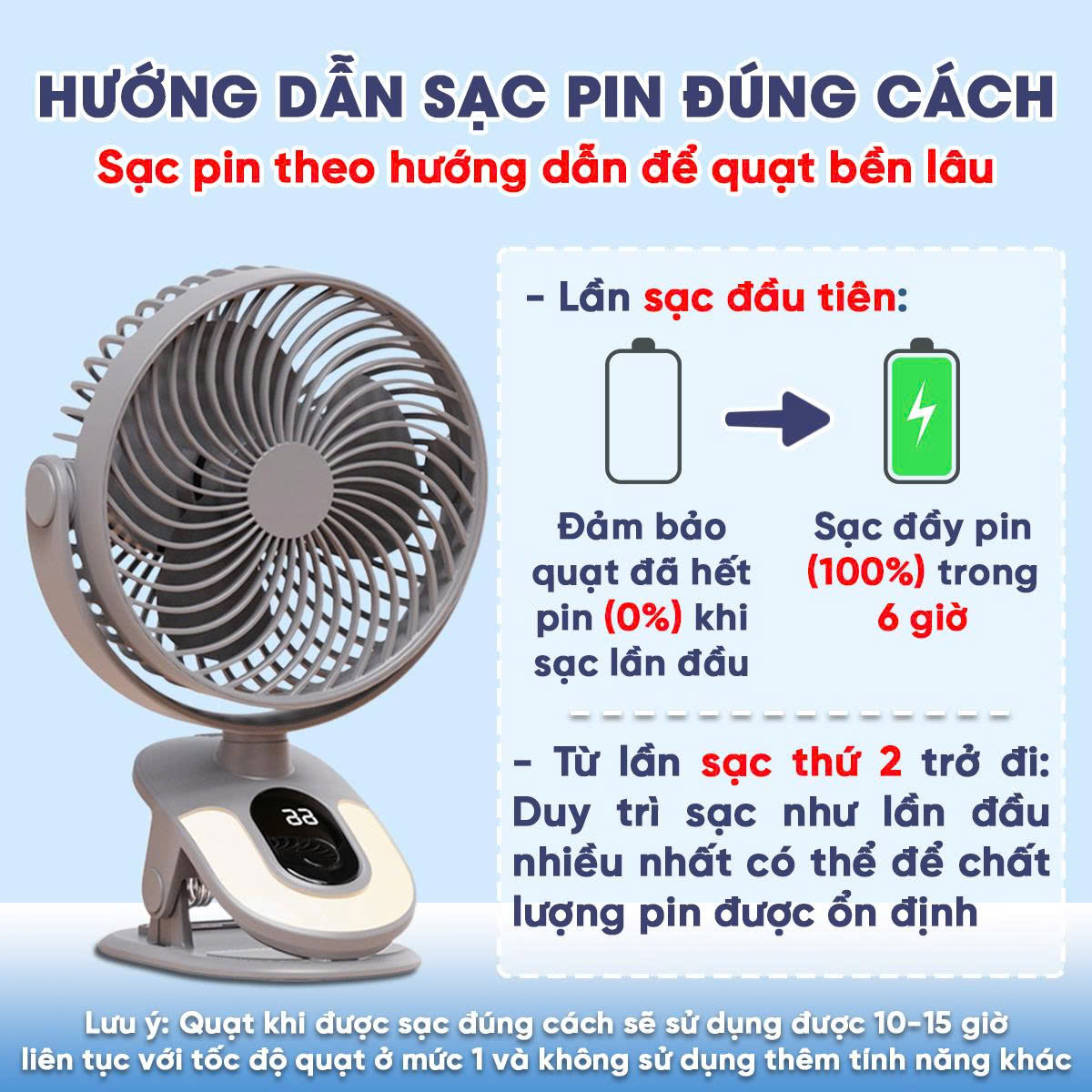 LƯU Ý: Dung lượng pin ở lần đầu sử dụng khi mở quạt sẽ là pin ảo nên khi mua quạt cần xả pin để quạt được sử dụng bền và ổn định hơn.