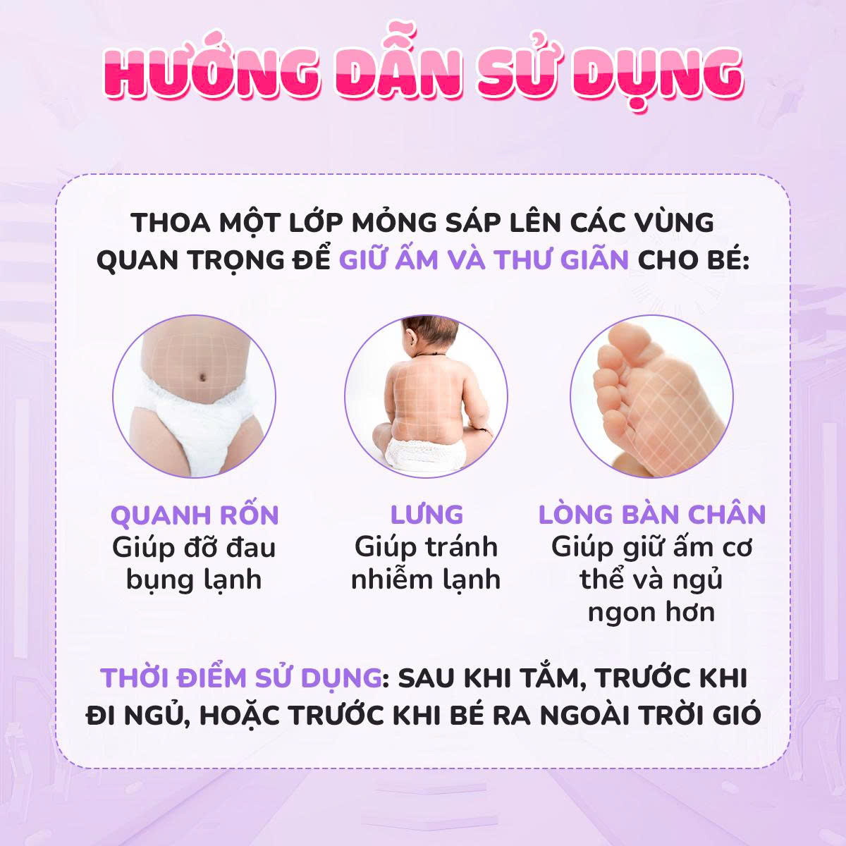 - Thoa một lớp mỏng sáp lên các vùng quan trọng để giữ ấm và thư giãn cho bé: