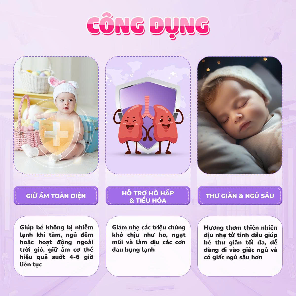 - Giữ ấm toàn diện: Giúp bé không bị nhiễm lạnh khi tắm, ngủ đêm hoặc hoạt động ngoài trời gió, giữ ấm cơ thể hiệu quả suốt 4-6 giờ liên tục
