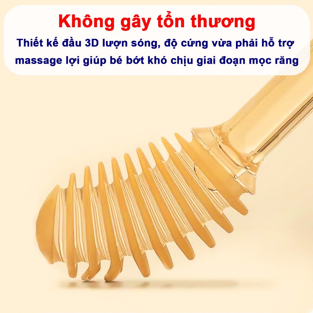 - Được thiết kế với đầu 3D lượn sóng hỗ trợ massage lợi giúp bé bớt ngứa và khó chịu giai đoạn mọc răng, độ cứng vừa phải, đảm bảo không gây tổn thương cho khoang miệng của bé
