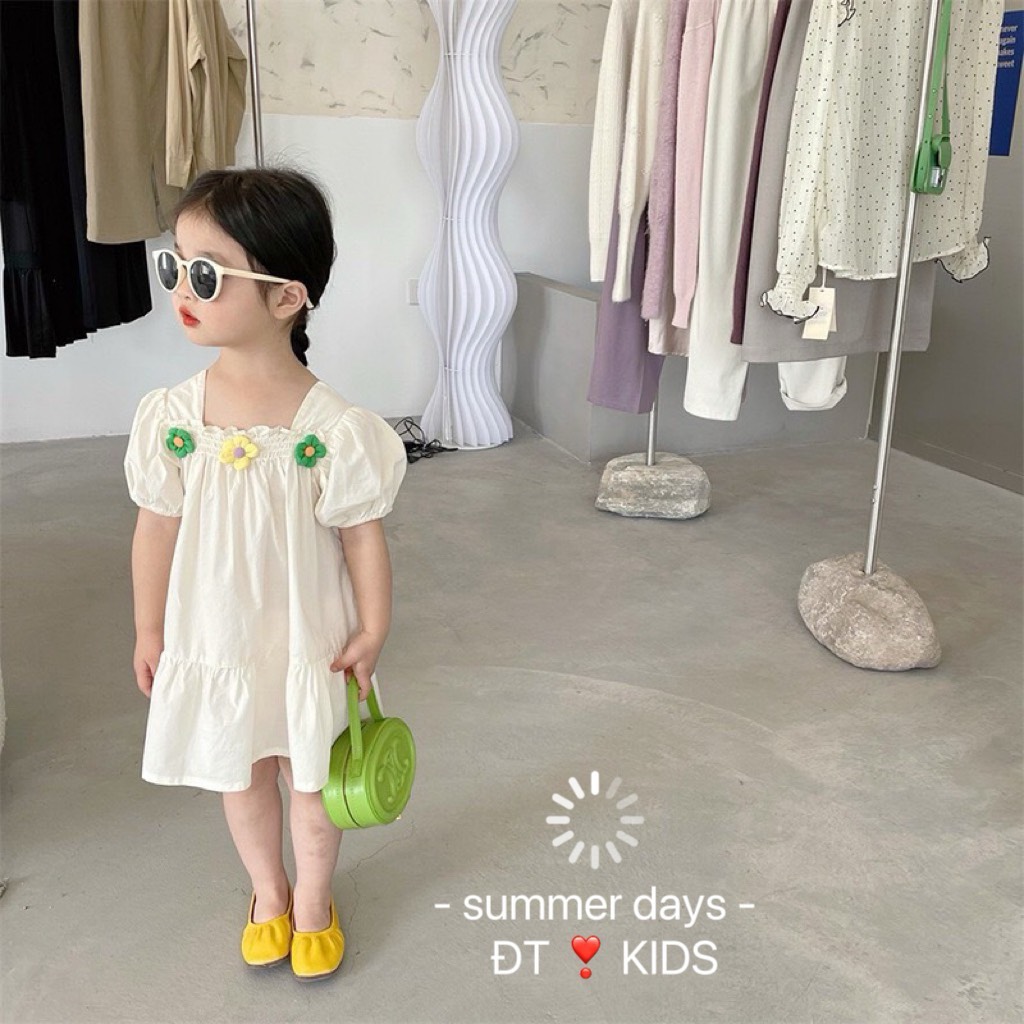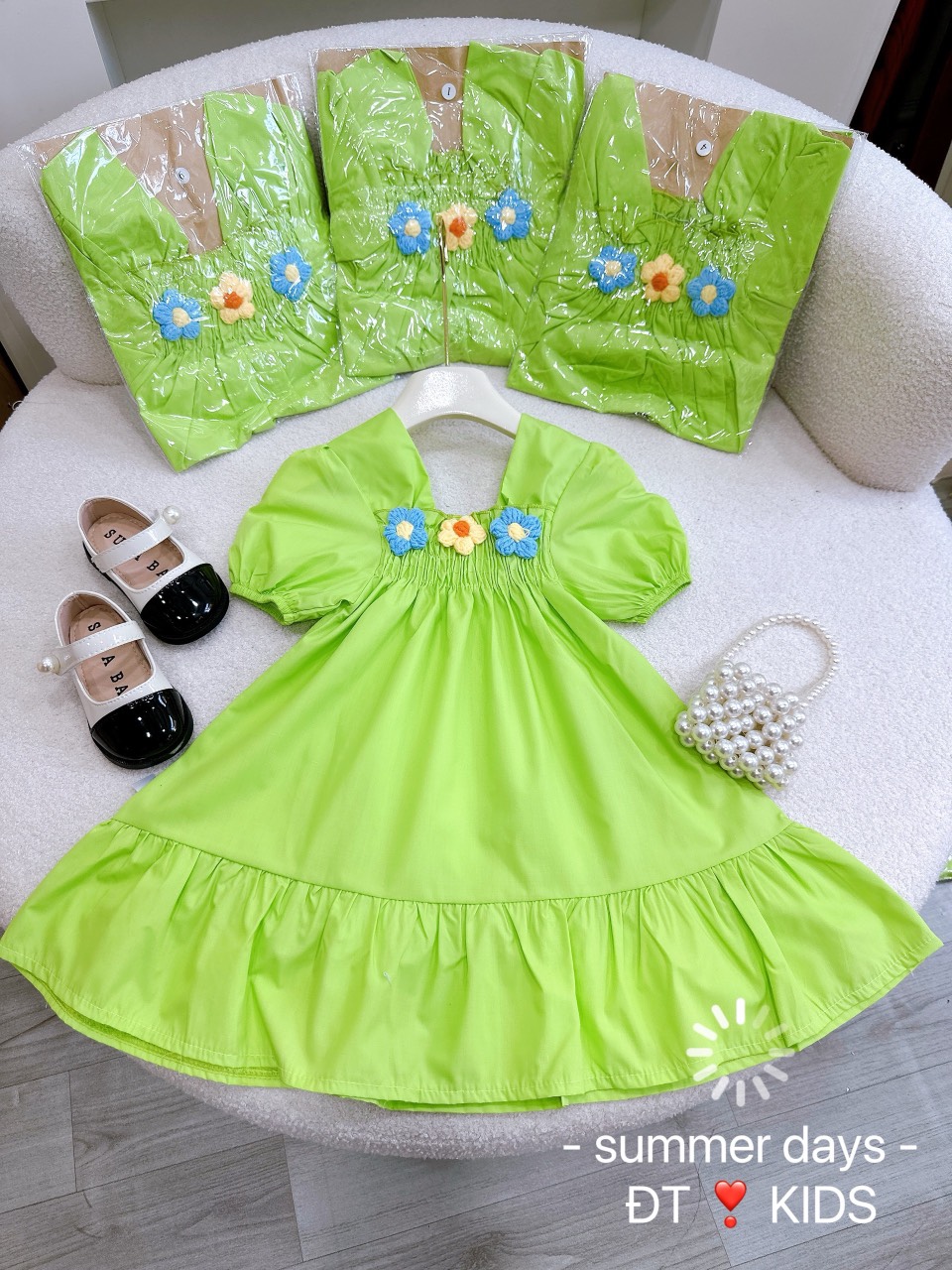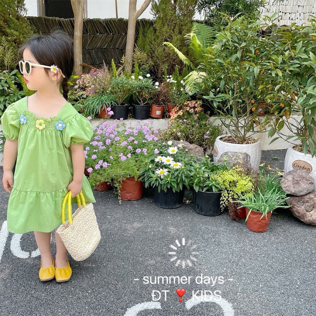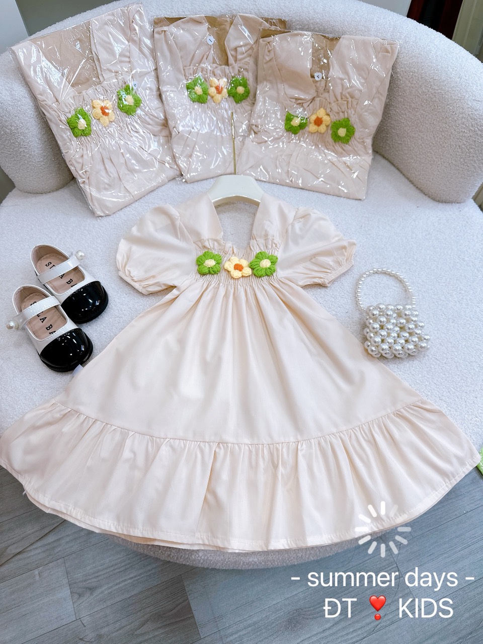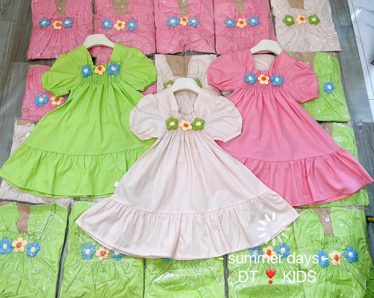 Váy bé gái, Đầm bé gái 10-25kg tay bồng nhún ngực phối hoa xinh xắn phù hợp cho bé mặc đi học, đi tiệc, đi chơi, dạo phố, đi biển, đi du lịch, diễn văn nghệ...